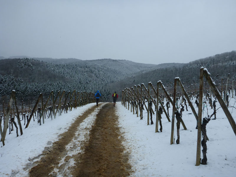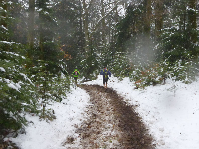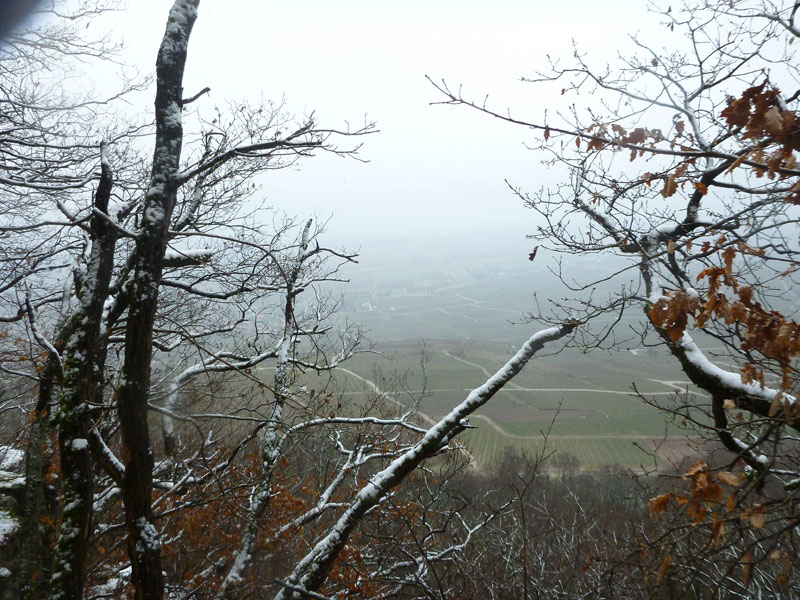 Auf der Anhöhe durch noch höher liegende Weinfelder dominiert Weiß das Landschaftsbild, der Regen geht jetzt bereits in Schnee über. Die Trails über den Pfad der Esel – der nicht so genannt wird, weil wir da Heute drüber trampeln – lassen sich noch gut belaufen. Den ersten Schnittpunkt erreichen wir bei km 5,5. Gegen den Urzeigersinn geht es für uns rechts ab, hinein in einen winterlichen Wald. Wunderschöne Singletrails, auf und ab, führen uns in Höhen zwischen 200 – 300 Meter über der Ebene des Rheintals an den Flanken der Vogesen entlang. Immer wieder lassen einem wunderschöne Überblicke wenigstens erahnen, was man bei klarer Sicht geboten bekäme.