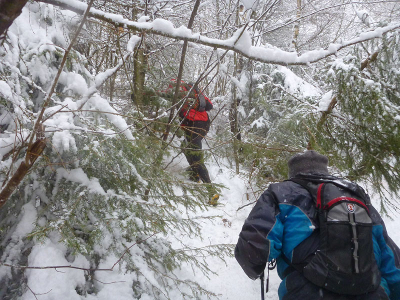 Weiter geht’s zum finalen Gipfelsturm. Den Singletrail durch den Wald habe ich vom Vorjahr noch in allerbester Erinnerung. Heute beginnen hier die größten Herausforderungen des Tages. Kaum einer kann sich ohne Zuhilfenahme sämtlicher Extremitäten auf den Füßen halten und so kämpfen wir uns mühsam Meter für Meter nach oben. Wo es geht, wird durch den Tiefschnee gestapft um der Eispiste zu entrinnen. Ein paar wenige ganz Clevere sind aber auch dabei, sie haben Yaktrax aufgeschnallt und zeigen uns sprichwörtlich die lange Nase. Zweifelsfrei hätte man heute größte Schwierigkeiten, diesen Pfad abwärts, wie im Vorjahr, unversehrt zu bewältigen.