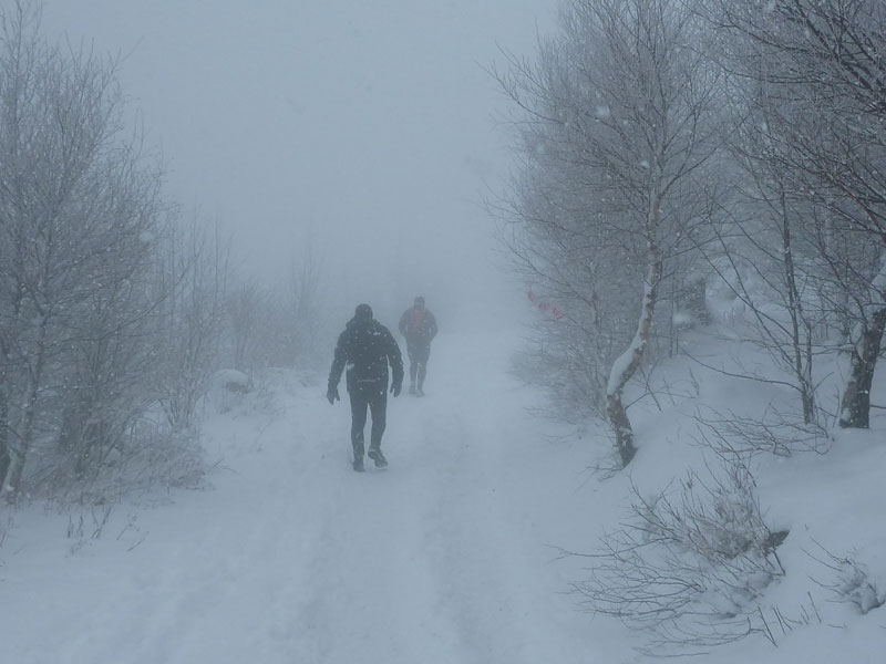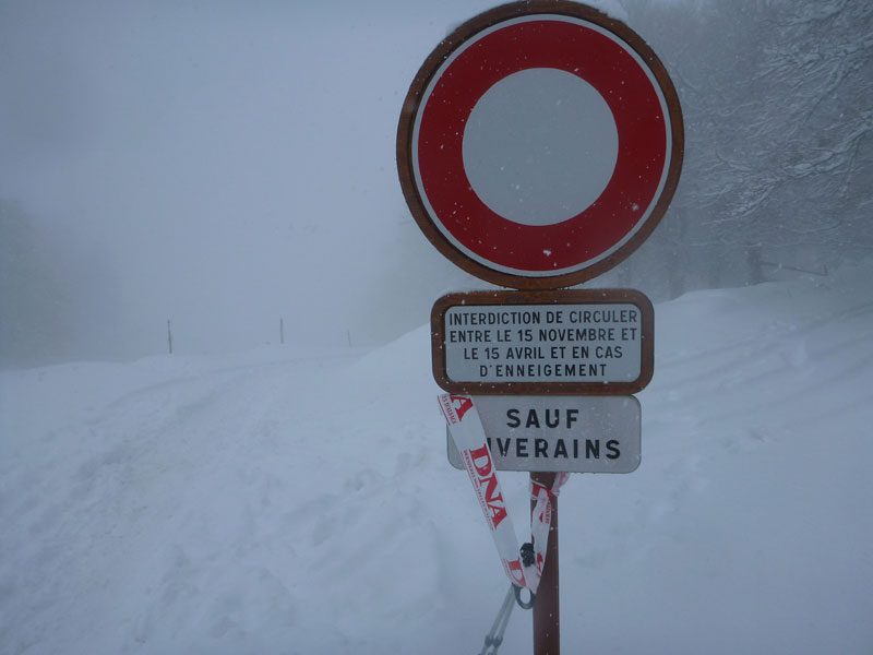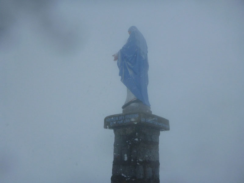 Zu Eis und Schnee kommt noch dichter Nebel, als wir die Baumgrenze und die schneebedeckten Stoppelfelder der Haute Chaumes erreichen. In Serpentinen geht es über freies Feld hoch zur Marienstatue, der Gipfelmarkierung des Petit Ballon. Nur noch Schemenhaft sind Vorder- und Hintermänner auszumachen. Der Schnee bläst uns fast waagerecht ins Gesicht. Zwar ist das hier nicht unbedingt ungewöhnlich, in den Vogesen herrscht stets ein strenges Klima. Im Winter vergleichbar mit Island, im Sommer häufig kühl mit rauen Stürmen und 2.000 mm Regen und Schnee im Jahresschnitt. Aber warum denn unbedingt heute?