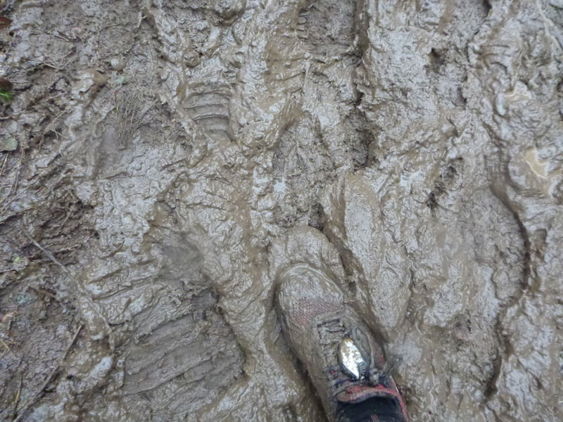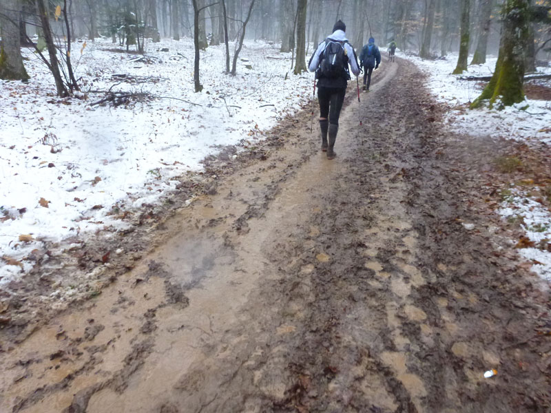 Gepflegt schlammig führen Waldwege nach Wintzfelden. Wildschweine und Trailer haben hier ihre wahre Freude. Mehr und mehr vermischt sich der Matsch mit wässrigem Schnee, was bisweilen eine rutschige Komponente ergibt. Gutes Profil auf den Sohlen ist hier enorm wichtig.