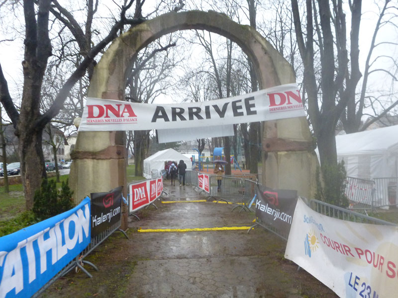 In Sichtweite der l’Eglise, der von weitem schon hervorstechenden Kirche von Rouffach, bekommen wir zum krönenden Abschluss noch einmal ein Schlammbad vom Feinsten. Ein schmaler Pfad durch ein Wäldchen lässt uns nicht die geringste Möglichkeit, irgendeinen unbefleckten Quadratzentimeter unserer Laufschuhe ins Ziel zu bringen. Ein letzter Downhill durch die Weinfelder und das Ziel an der Allee de Humaniste ist erreicht. Finishershirt und ein Mirofaserhandtuch werden direkt nach dem Zieldurchlauf überreicht.