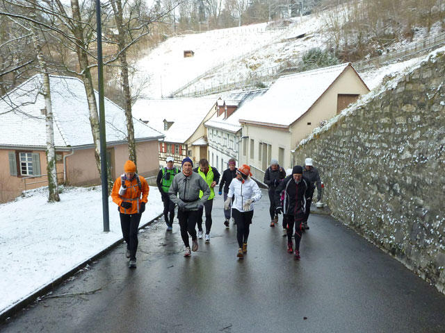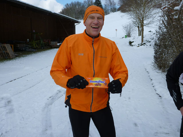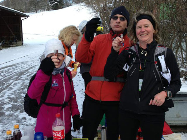 Ab der nächsten Rheinbrücke (km 4,5) ist die Stadtbesichtigung beendet, es geht rechts ab für uns und für 3 km nach oben, nach einem kurzen Ortsdurchlauf sind wir im Hinterland. 100 Höhenmeter beinhaltet dieser Abschnitt bis zum höchsten Punkt der Runde (km 8,5). Auf der Anhöhe bekommen wir eine herrliche Panoramasicht auf Neuhausen und den Rhein. Zwischendrin, am Schützenhaus, hat Jörg eine First-Class-Verpflegungs-Oase für uns errichtet. Unter der Woche hat ihn ein Virus erwischt, so betätigt er sich heute als selbsternannter Stullenschmierer.