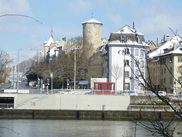 Seinen Namen verdankt das rechts von uns liegende Schlössli dem Standort, einer vom Wasser umspülten kleinen Insel, die man früher als „Werd“ bezeichnete. Bis Mitte des 19. Jahrhunderts war es ein bedeutender Umladeplatz einer Handelsstraße, die vom Bodensee nach Basel führte. Als Mitte des 19. Jahrhunderts die Eisenbahn gebaut wurde, verlor diese Verkehrsache an Bedeutung und das Schlössli wurde 1835/36 als Gaststätte umgebaut. Heute finden sich im Gebäude diverse Gastronomiebetriebe, sowie ein Souvenir-Shop. Im ersten Stock bietet eine Terrasse, aus nächster Nähe eine fulminante Aussicht auf den Rheinfall.