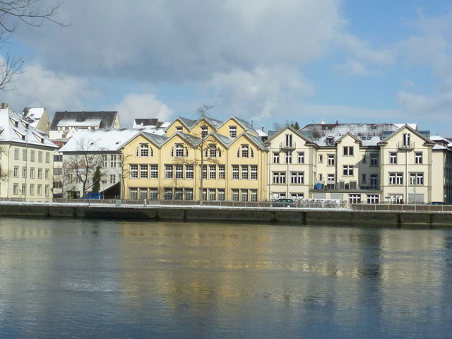 Daniel fungiert als Fremdenführer und erklärt uns die markantesten Punkte der Schaffhauser-Stadtsilhouette am gegenüberliegenden Ufer. Der Diebsturm sticht sofort ins Auge, er war Bestandteil der mittelalterlichen Stadtbefestigung. Der Rundturm mit dem polygonalen Zeltdach wurden über viele Jahre als Gefängnis genutzt. Die ehemalige Kammgarnspinnerei ein paar hundert Meter weiter dient heute als Kulturzentrum, beherbergt ein Tonstudio, Übungsräume für Musiker zudem eine Galerie für moderne Kunst. Die gibt es auch im Rhein zu sehen, in Form von Skulpturen von Kurt Bruckner, einem ortsansässigen Maler und Bildhauer und fast Nachbar von Daniel.