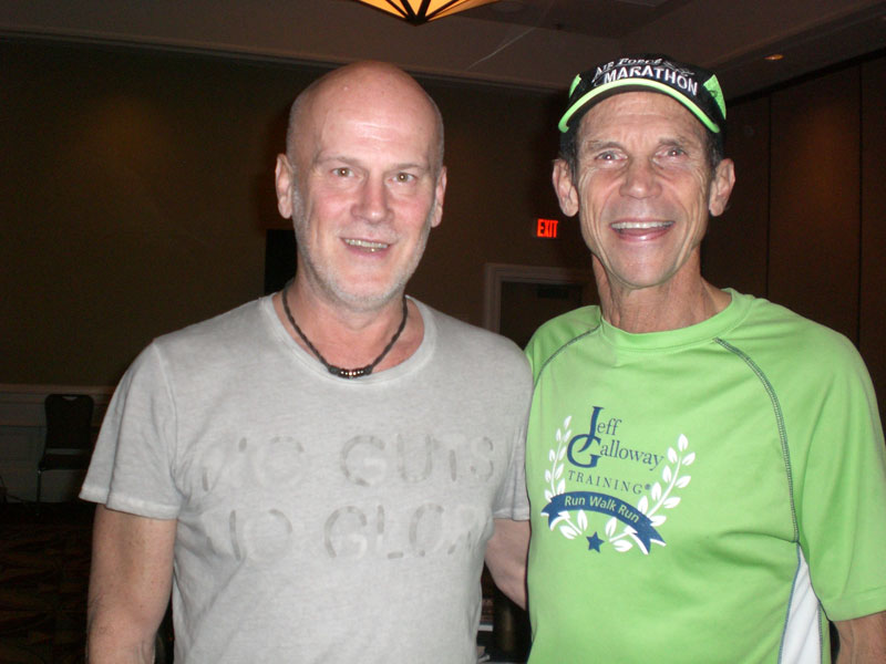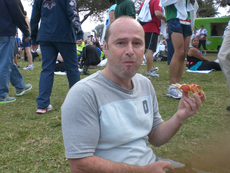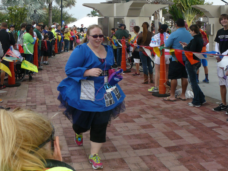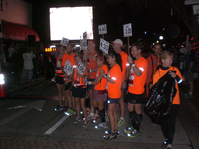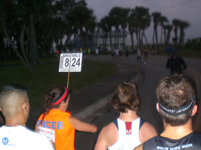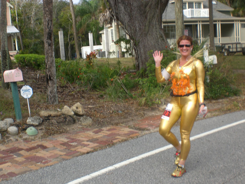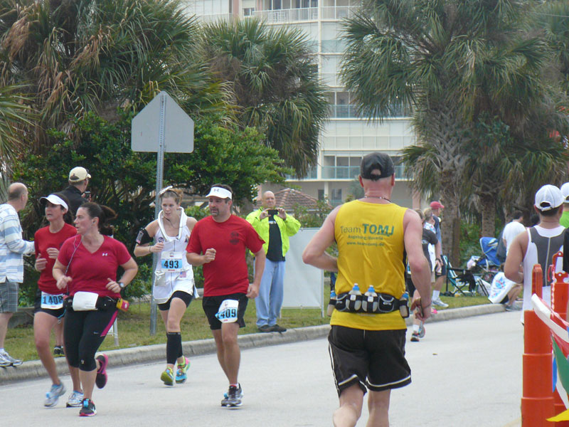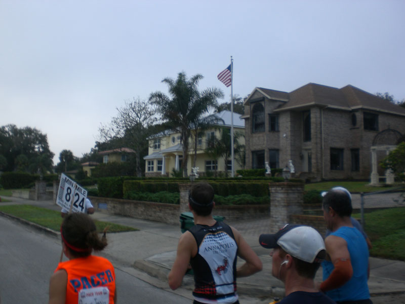 Mit meinem TOMJ-Shirt und der Laufhose in Lederhosenoptik wurde ich immer wieder angesprochen. Unter anderem auch von Carolin aus Trier, die hier in Ocala seit 2006 lebt und dort verheiratet ist. Sie lief mit mir ca. 10 km und musste dann aber abreißen lassen. Ich spürte bei km 30 meine zwei zugenommenen Kilos und musste meine Pace etwas zurücknehmen. Von einer lustigen Familie, die es sich vor ihrem Haus bei Musik und Grill mit Getränken gemütlich gemacht hat, wurde ich zum Essen und Trinken eingeladen. Ich hielt aber nur zu einem kurzen Fotostopp und machte mich mit den Worten „I have to go“ weiter auf den Weg zum Finish. Wurde dabei aber noch von den Pacern für 3:45 und 3:50 überholt. Die Armen mussten den ganzen Marathon ihre Zeittäfelchen am Stiel in die Höhe halten. Von Luftballons haben die wohl noch nichts gehört. Ich überholte immer mehr Marathon- und Halbmarathonläufer. Oder muss ich Geher sagen? Da liefen wirklich übergewichtige Specklinge, das glaubt man nicht. Aber jeder ist hier ein Held, der ins Ziel kommt. Egal wie. |