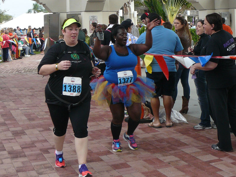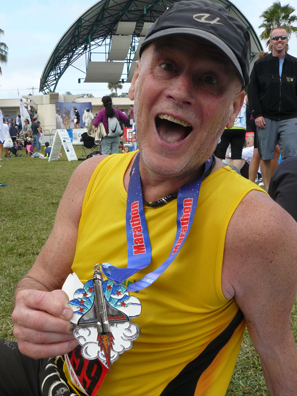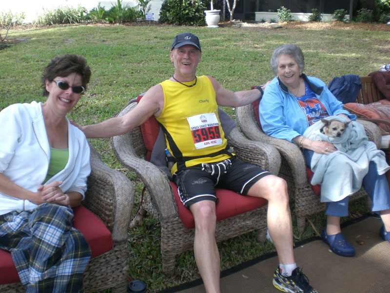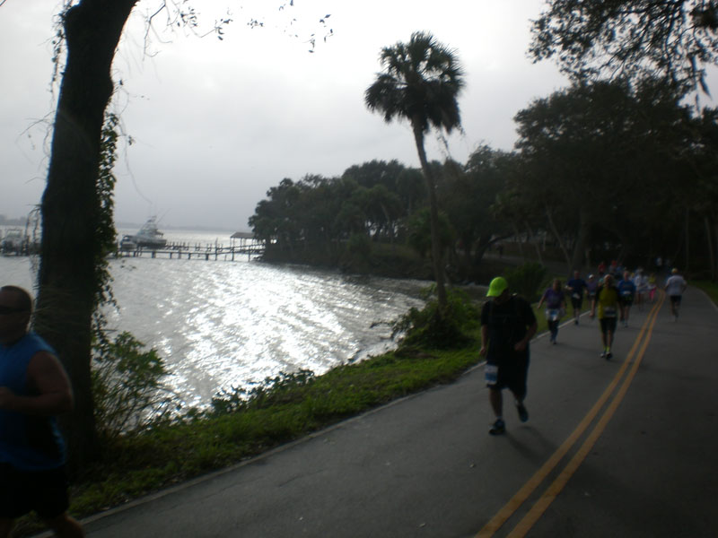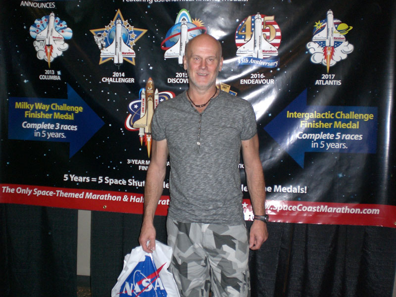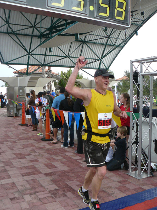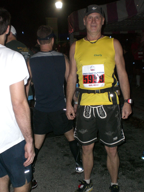 Bereits sehr früh um 6 Uhr beklatschen wir die 3.000 Halbmarathonstarter und bald ging es auch für uns Marathonis um 6:30 Uhr los. Nach live gesungener amerikanischer Nationalhymne und dem Startcountdown eines Spaceshuttles von der Videowand, war ich auch schon mitten im Lauf. Es war noch recht dunkel und etwa 15 Grad warm. Wir liefen zuerst auf Cocoa’s weihnachtlich geschmückter Mainstreet Richtung Norden und auf der palmengesäumten Uferstraße des Indian River, an schönen Häusern vorbei bis zum Wendepunkt bei km 10,5. Mit zunehmender Helligkeit wurde es auch immer wärmer und die Luftfeuchtigkeit machte sich mit heftigem Schwitzen bemerkbar. Alle 3 km gab’s Gatorate und Wasser. Ich hatte meine Getränkefläschchen am Gürtel und brauchte dort lange nicht zugreifen. Nur hatte ich zu wenig Vaseline unter den Achseln aufgetragen und spürte schon bald Scheuerstellen. Auch schon wurscht. Ich musste einfach durch. Daheim gab es am 1. Advent Kaffee mit Plätzchen und ich lief dem Winter davon. Schön so.