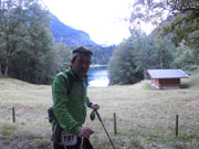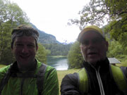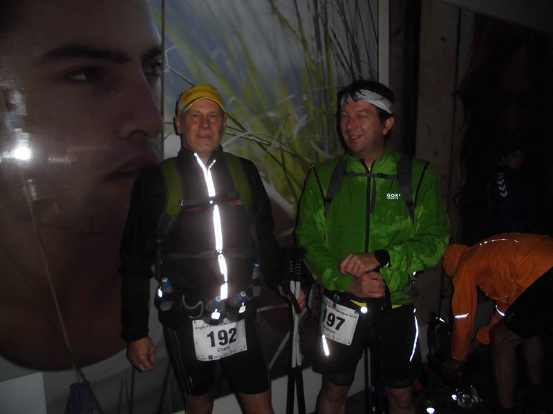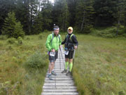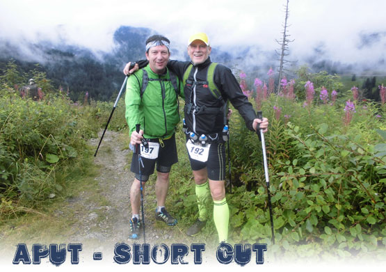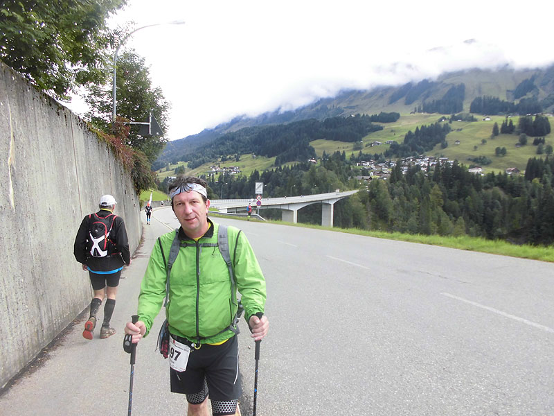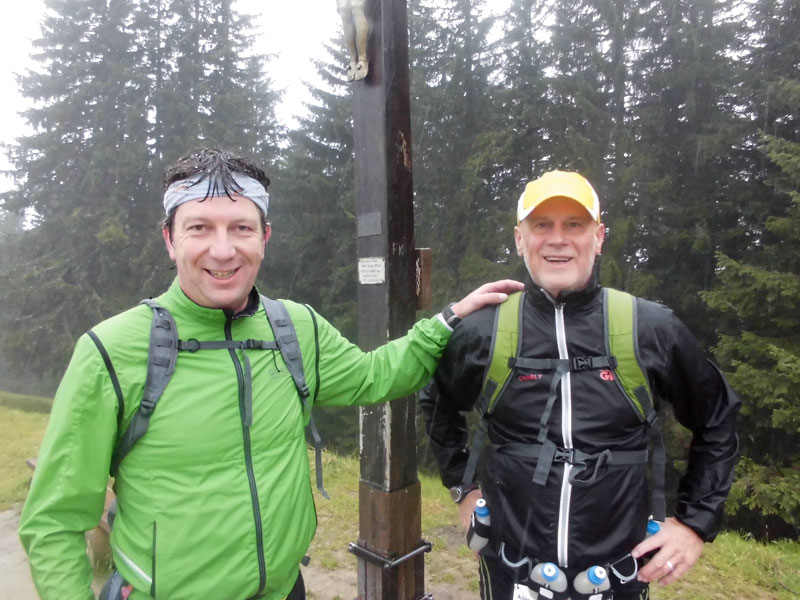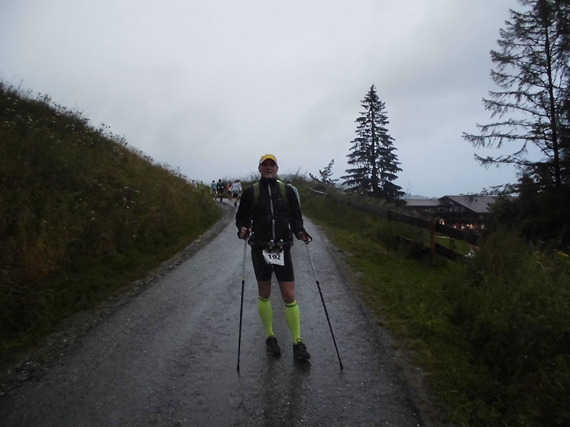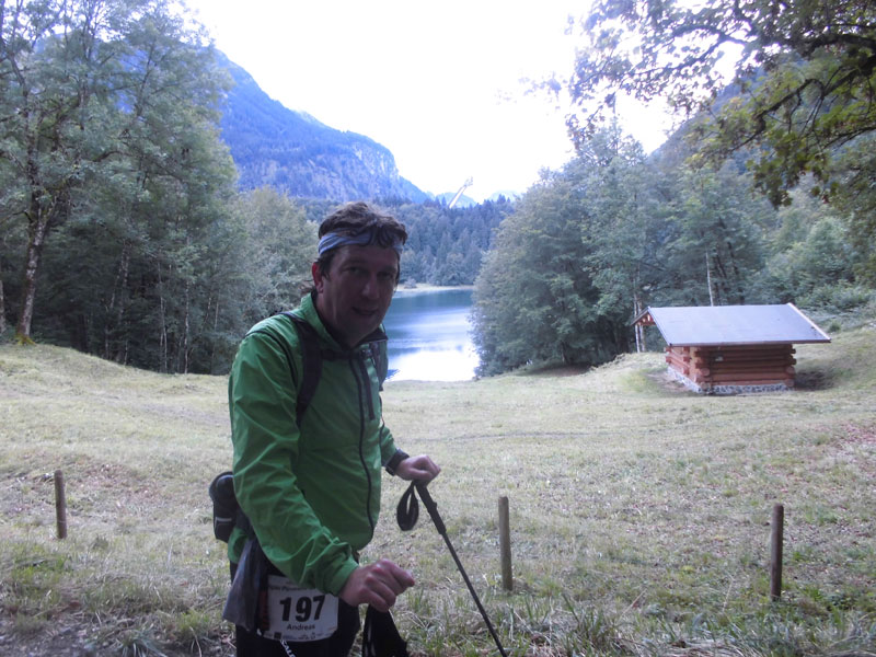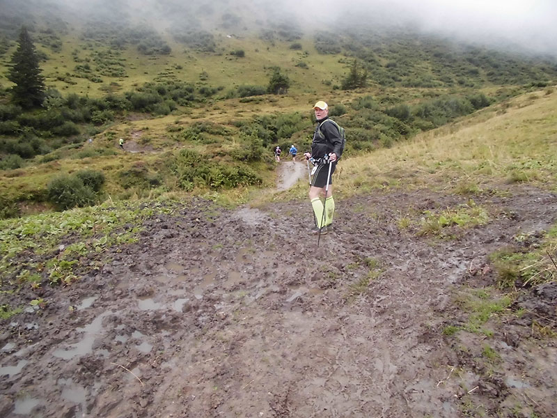 An dieser Stelle muss ich mal die Organisatoren dieses Laufs loben. Waren beim APM bzw. APUT bis zu diesem Tag ja Regen und Kälte ein Fremdwort, hätte ich nie damit gerechnet an den Verpflegungsständen auch was Wärmendes zu erhalten. Am Hörnlepass kurz vor Kilometer 35 gab`s tatsächlich heiße Suppenbrühe. Toll. Zwei Becher später, war ich wie neu und freute mich richtig auf`s weiterlaufen. Auch Charly war gut drauf und so setzten wir unseren Weg fort und liefen gut gelaunt durch das Kleinwalsertal. Schließlich durchquerten wir die Ortschaft Außerschwende, überquerten die hohe Brücke nach Unterswestegg, um uns dann an den nächsten großen Anstieg zu machen, Die Schrattenwangalpe am Söllereck war unser Ziel und wir konnten inzwischen einen guten Ausblick über die Oberstdorfer Berge genießen, da sich doch ab und zu die Sonne durch die Wolken wagte. Der Regen hatte unbemerkt, seit rund einer Stunde aufgehört. |