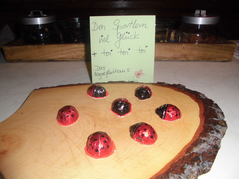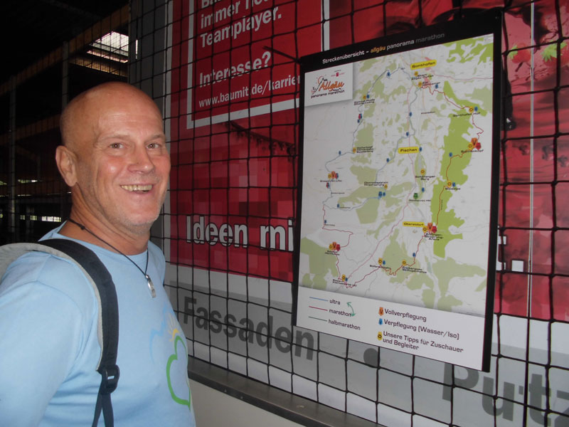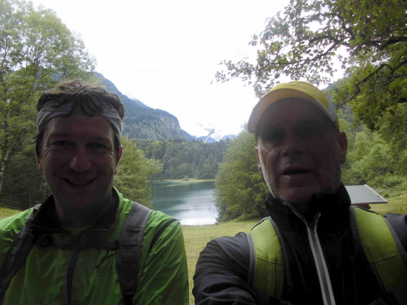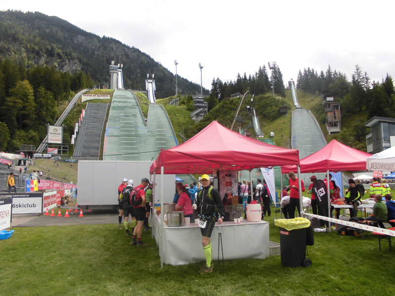Bei Grasgehren wartete bei Kilometer 19 der erste Cut-Off auf uns. Wir hatten uns vorgenommen diesen in rund 2:45 Stunden zu erreichen, damit wir für den weiteren Verlauf ein Polster haben und um es etwas ruhiger angehen lassen zu können. Wir landeten nahezu eine Punktlandung und widmeten uns der ersten Vollverpflegung. Butterbrot mit Salz, das war echt genial. Frisch gestärkt ging‘s weiter. Die nächsten vier Kilometer kannten wir ja immer noch vom Marathon und freuten uns schon auf Kilometer 23, denn dort zweigten wir ab in Richtung Kleinwalsertal und betraten Neuland. Noch vor Erreichen der österreichischen Grenze begann plötzlich mein Laufrucksack zu singen und ich brauchte etwas um zu wissen warum. Ach ja, es war ja Handypflicht und ich hatte mir mangels eines eigenen Mobiltelefons, das von Silke ausgeliehen und ich war wohl ins österreichische Mobilnetz eingetaucht. Das konnte ich jetzt nicht ändern, auch meine Mitläufer mussten eine Zeitlang der Stimme von Franz Beckenbauer lauschen, der mich penetrant aufforderte an mein Handy zu gehen. Doch irgendwann verstummte auch er und es kam schon bald die nächste Vollverpflegung in Sicht.