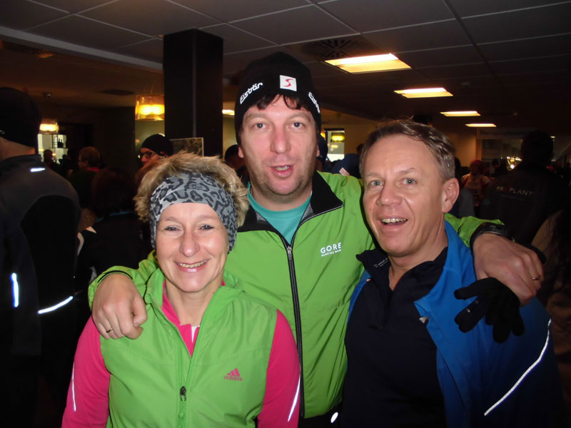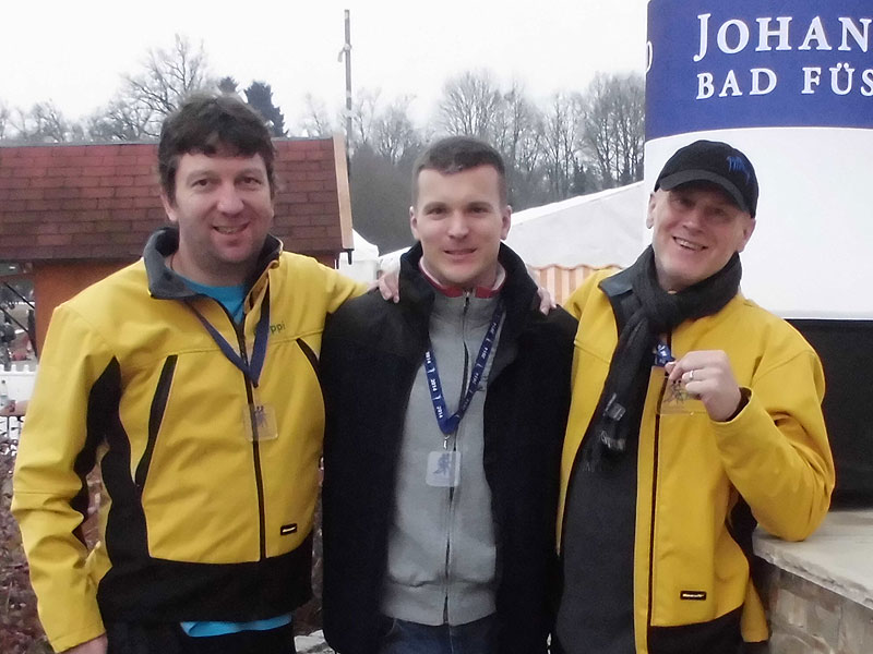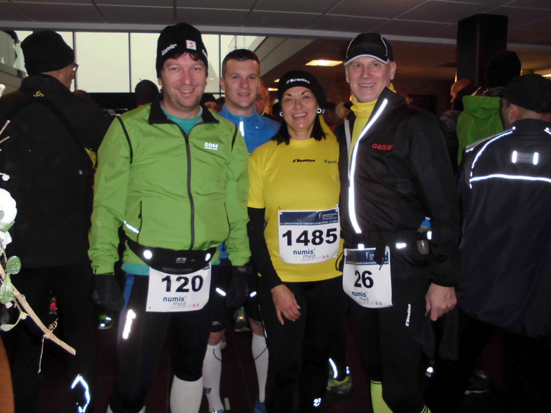 Nach einer kurzen Verschnaufpause und ein paar Bechern warmen Tees, ging ich zum Duschen. Dort traf ich unseren frisch gebackenen Marathoni Michael. 3:37 Stunden ist er gelaufen. Respekt, für eine Premiere wirklich beachtlich. Er spielte sogar noch mit dem Gedanken sich den 3:30-Pacer zu holen, brach jedoch dann deutlich ein und ließ von dem Vorhaben ab. Charly traf ich im Bad und wir plantschten noch kurz im warmen Thermenwasser und erschreckten ein paar ältere Damen. Auch bei ihm war alles ohne Probleme gelaufen. 3:52 Stunden sind auch eine super Zeit. Wir waren alle zufrieden und wollten uns nun zum Abschluss noch kurz stärken. Während die Siegerehrungen im Gange waren, genehmigten wir uns alle noch eine ordentliche Portion und vernahmen mit Freude, dass es auch Karin gut gegangen war. Danach brachte uns Charly allesamt sicher nach Hause, auch wenn unterwegs der versprochene Schneeregen einsetzte, was das Fahren etwas mühsam werden ließ.