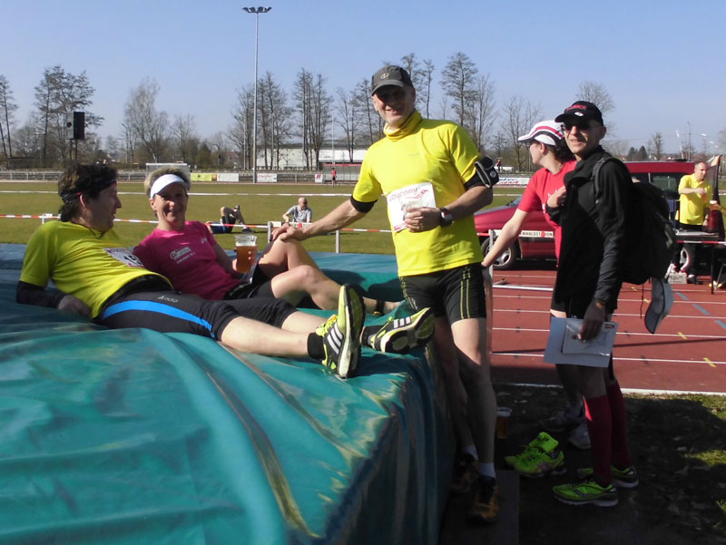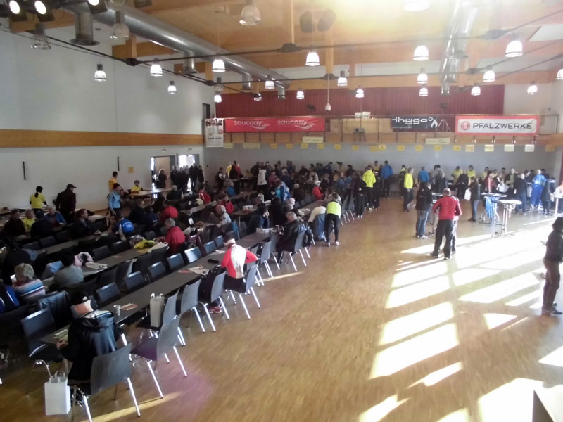 Danach gingen wir noch auf einen Kaffee und ein Stück Kuchen in die Nachbarhalle. Dort trafen wir natürlich wieder auf den ein oder anderen kuriosen Läufer, der mit der ein oder anderen Geschichte aufwarten konnte. Letztlich gesellte sich auch Klaus Duwe, der marathon4you.de-Boss zu uns an den Tisch und wir konnten uns eine ganze Zeit lang gut über diverse Lauferlebnisse austauschen. Natürlich waren Klaus‘ Ansichten besonders interessant, hat er doch bedeutend mehr Marathon-Erfahrung als ich. Nur ein Kommentar machte mich kurz stutzig. Als er mich fragte, ob ich schon mal hier gelaufen sei, musste ich verneinen. Er meinte, gut. Ich sagte dann besser nichts, ich will Euch das Ganze nicht schon im Voraus madig machen. Oh Mann, ich dachte die Teilnehmerzahl und die Geschichte des Bienwald-Marathons sprechen für sich: Seit 1976 wird der Lauf ohne Unterbrechung ausgetragen und gilt damit als einer der ältesten Marathonveranstaltungen in Deutschland. Der muss doch schön sein, oder? Lass es einfach auf Dich Zukommen dachte ich und Charly und ich genehmigten uns noch einen Kaffee.