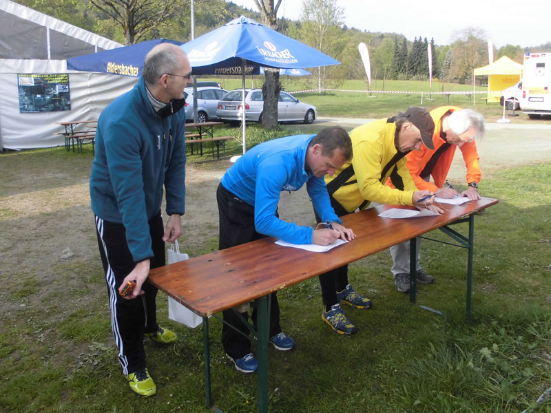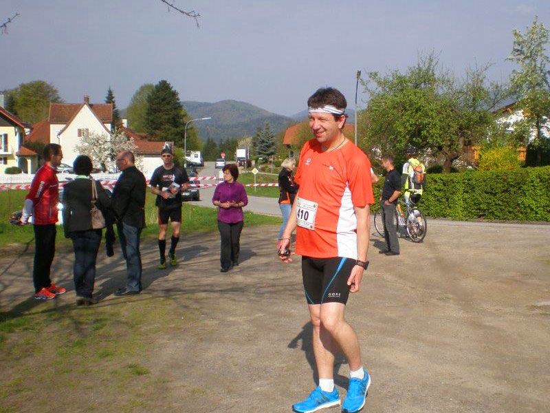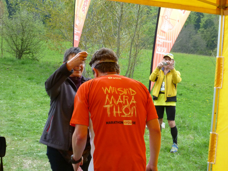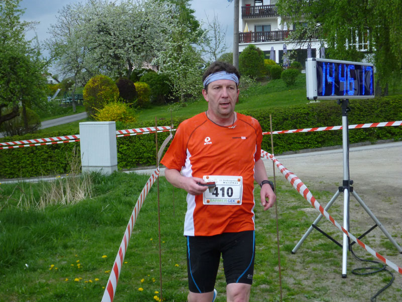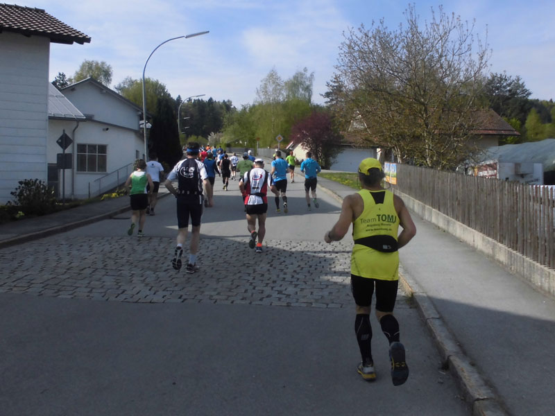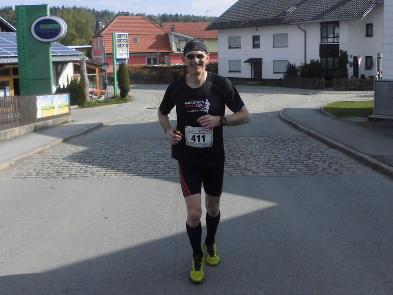 Kurz vor Thurmansbang sprang vor mir plötzlich Bernie wieder auf die Strecke. „Da rechts ist eine Hütte, da musst Du hin“, rief er mir zu. Ich verstand nur Bahnhof. Als ich auf Höhe der Hütte angekommen war, sah ich eine Gruppe Jugendlicher, die dort den Grill angeworfen hatten. Bernie hatte sich wohl mal schnell selbst eingeladen. „Komm doch rüber“, riefen sie mir zu „Dein Kumpel hat Dir noch einen Schluck Bier übergelassen“. Zu verlockend war die Idee, doch ich musste dankend ablehnen. Ein Blick über die Schulter verriet mir, dass die Läuferin mit der roten Laterne gefährlich nahe gekommen war. Auch wenn mir Platzierungen und Zeiten wirklich egal sind, letzter wollte ich dann doch nicht werden. So hatte ich auf den letzten Kilometern wirklich noch zu ackern. Immer wieder warf ich einen Blick über die Schulter und ich konnte meinen Vorsprung bis ins Ziel halten. Ich war 35. bei einen Marathon. So eine gute Platzierung hatte ich noch nie erreicht, was aber nur aufgrund der 36 Teilnehmer möglich war.