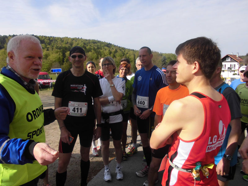 Um zehn Uhr war es dann so weit. Immerhin 36 Marathonis hatten sich am Start eingefunden und bekamen noch eine kurze Einweisung. Ein Teil der Strecke sollte nämlich auf einer Staatsstraße verlaufen, die für den Verkehr nicht gesperrt war. Hier sollten wir stets links laufen und auf den Verkehr achten. Warnschilder waren jedoch angebracht, die die Autofahrer auf uns Läufer hinwiesen. Landrat Ludwig Lankl hatte zum letzten Mal die Ehre den Startschuss abzugeben, wie er in einer kurzen Ansprache erklärte.