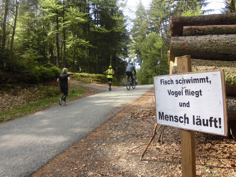 Dann war es soweit und los ging`s. Thurmannsbang und die einzigen Zuschauer hatten wir bereits nach rund fünfhundert Metern hinter uns gelassen. Bernie und ich schossen unsere ersten Fotos und mussten feststellen, dass wir schon das Schlusslicht der 36 Läufer bildeten. Aber erst galt es mal auf dem nächsten Kilometer die ersten einhundert Höhenmeter dieses Laufs zu überwinden. Auf einer Teerstraße ging es in den Wald und das stetig bergan, so dass man relativ schnell warmgelaufen war. Das Feld hatte sich hier schon relativ auseinandergezogen. Die meisten Teilnehmer waren doch eher ambitionierte Marathonläufer und liefen um Platzierungen und Zeiten.