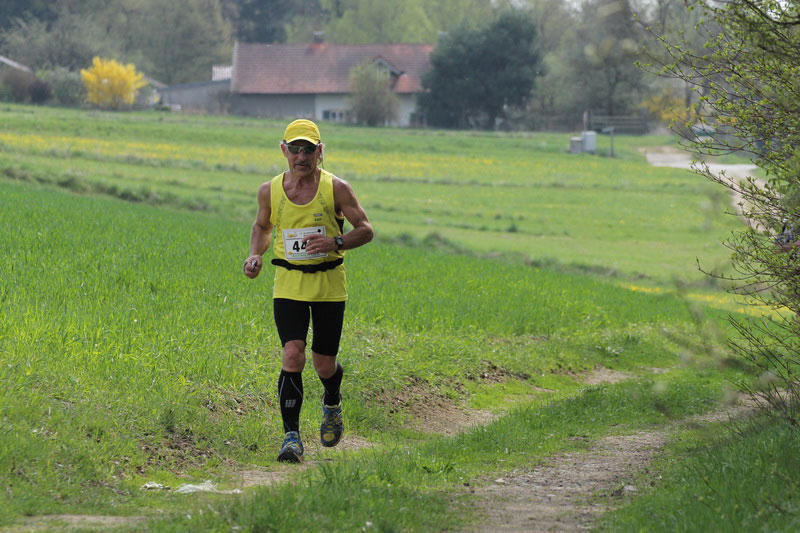 Oben angekommen mündete die Teerstraße in einen breiten Waldweg, der die nächsten Kilometer sachte bergab führen sollte. Es war wirklich ein Traum hier zu laufen. Der Mischwald zeigte sich hier von seiner schönsten Frühlingsseite, das noch übriggebliebene Herbstlaub bedeckte die geschmeidigen Waldwege …einfach nur schön. Also einfach nur laufen lassen und genießen. Als wir unten angekommen waren, verließen wir den Wald für ein kurzes Stück und hatten sattgrüne Wiesen neben uns, an denen wir vorbeilaufen durften. Kurz darauf bogen wir auf dem Feldweg nach links ab, um uns dem nächsten Waldstück zu nähern. Tolle Bäume mit ihren rosa und weißen Blüten säumten den Weg.