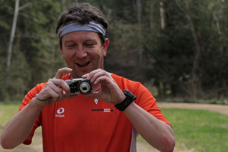 Ich traf hier auch wieder mit Bernie zusammen. Er war sich anfangs ja noch nicht sicher, ob er aufgrund seiner Achilles-Sehnen-Probleme beide Runden laufen sollte, aber nun war er es. Zu schön sei das Wetter und die Landschaft, als dass er im Ziel zwei Stunden auf Jan und mich warten wollte. Sein Entschluss beide Runden zu laufen, war gefällt. Im Wald angekommen, gab es den nächsten Anstieß zu bewältigen.