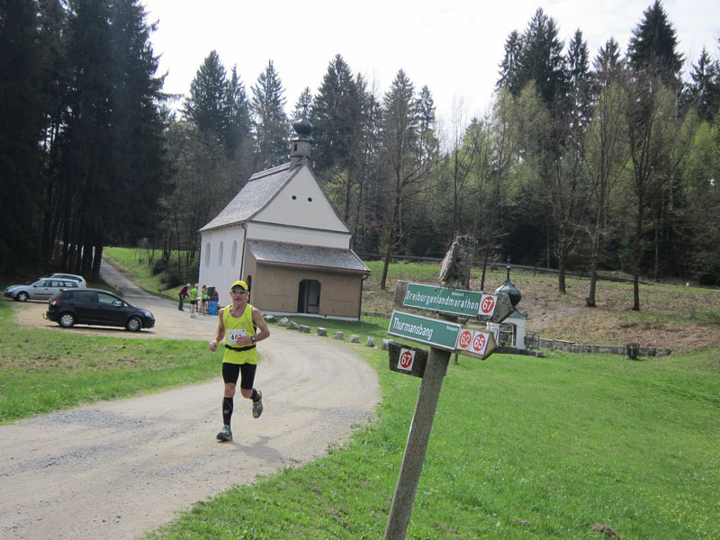 Vorbei am Museumsdorf müssen wir Läufer die Straßenseite wechseln. Durch eine Unterführung unter der Staatsstraße hindurch, ein paar Treppenstufen hoch und schon sind es nur noch ein paar hundert Meter und wir haben den Dreiburgenlandsee erreicht. Der See ist wunderschön gelegen und wir legen die ersten paar Meter auf einem Wanderweg rund um den See zurück. Ein wohl künstlich angelegter Sandstrand ist im Sommer sicherlich ein Magnet für junge Familien und ihre Kinder. Etwas weiter passieren wir das Hinweisschild auf einen Barfußpfad. Hier kann man, natürlich mit blanken Füßen die natürlichen Untergründe am eigenen Leib erfahren. Schon ein paar Schritte weiter erreichen wir die nächste der gut ausgestatteten Verpflegungsstellen an der Bründl-Kapelle. Hier kann man Heilwasser schöpfen, das vor allem Augenleiden lindern soll. Da ich die schöne Umgebung aber ohne Probleme wahrnehmen kann, entscheide ich mich für einen Becher Cola und laufe weiter. |