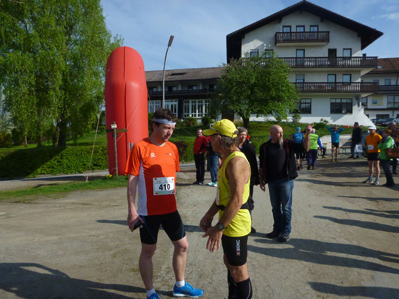 Parkplätze finden sich auf einer Wiese direkt am Startplatz, wir sind die ersten Parker und werden sogar persönlich vom Chef der Veranstaltung eingewiesen. Ludwig Schürger ist mit seinem Vital & Wellnesshotel Schürger Organisator und Veranstalter. Praktisch, so kann er Läufern auch preisgünstige Zimmer am Veranstaltungs-wochenende anbieten. Dusch- und Massagemöglichkeit für unseren Lauf sind ebenfalls im direkt neben dem Startplatz gelegenen Hotel untergebracht. Überhaupt ist der Ludwig Schürger ein ziemlich umtriebiger Geschäftsmann, neben Marathon veranstaltet er u. a. noch Gesundheitswochen, Laufkurse, Ballonfahrten, Rutengeher-Kurse und Schneeschuh-Tage. Wer im Bayerischen Wald ein paar aktive Urlaubstage verbringen will, ist hier also gut untergebracht.