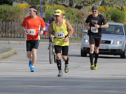 Meine Sorgen sind sicherlich berechtigt, falls meine Kontrahentinnen wieder aufschließen würden. Aber keine Frage, ich gehe natürlich in die zweite Runde, das wäre ja noch schöner, schließlich fühle mich noch erstaunlich gut und meine Achillessehen beschweren sich auch noch nicht besorgniserregend. Die meisten Marathonis sind durch und von den, eine Stunde später gestarteten Halbmarathon-Läufern ist scheinbar auch noch niemand in Sicht. So beende ich eigentlich relativ unbeachtet meine erste Runde und den Zieldurchlauf. Nach einer kleinen Stärkung neben dem Zielbogen, wo auch Gels im Angebot stehen, mache ich mich schnell vom Acker und begebe mich direkt zum steilen Anstieg am Ortsende. |