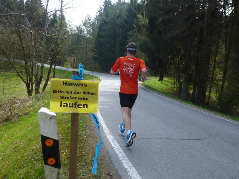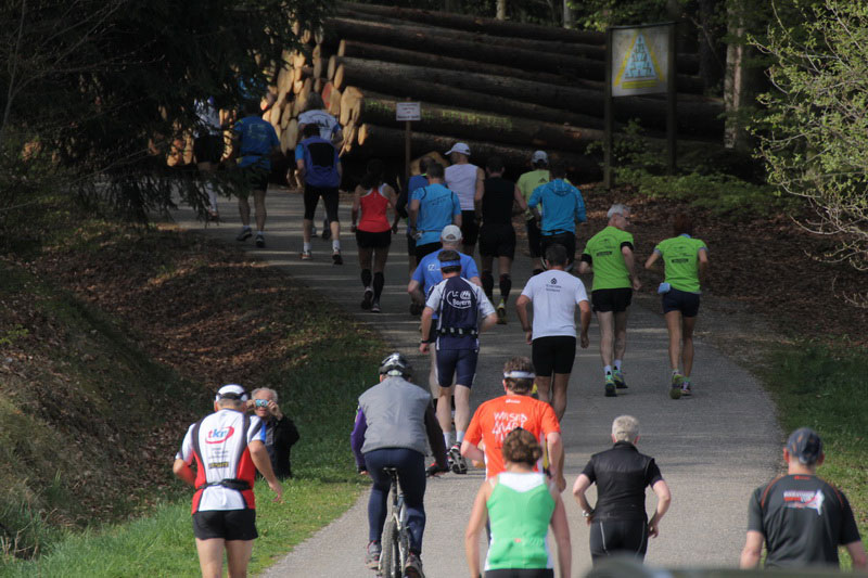 Ich schalte ab Steigungsbeginn sofort auf mein Achillessehen-Schonprogramm, das heißt ich marschiere. Mein Trainingspensum vom vergangenen halben Jahr war bewusst bescheiden, normalerweise langt das nicht ansatzweise um jemand einen Marathon zu empfehlen. Nach zwei Jahren chronischer Entzündungen in den Achillessehen möchte ich die Pest endlich loswerden. Eine Runde habe ich eingeplant, aber evtl. doch mit der Option nach mehr, falls mir die Sehnen heute freundlich gesinnt sind.