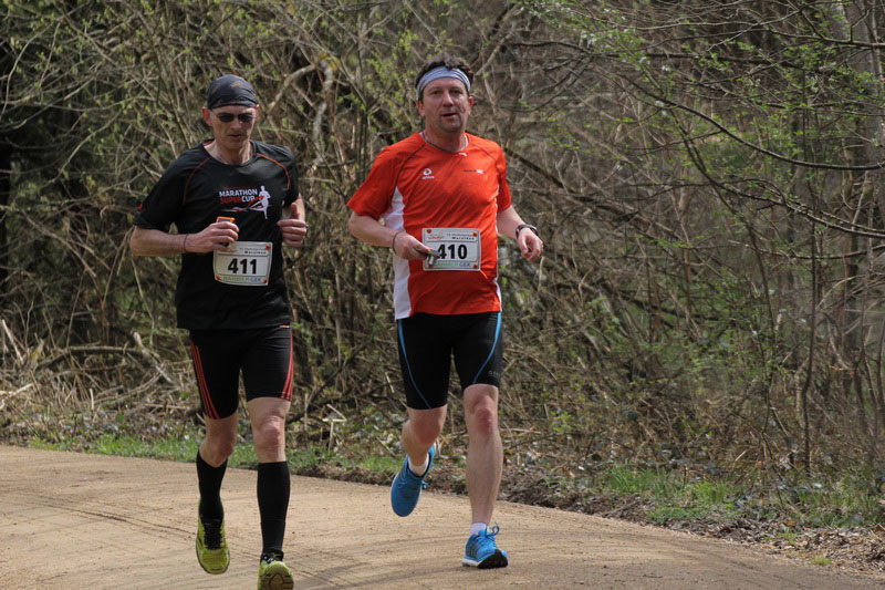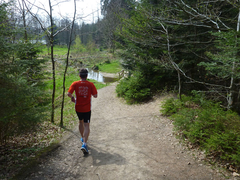Die „Grüne 409“ und die „Schwarze 429“ müssen auch gehen, so wechseln wir am Ende liegenden, immer wieder die Positionen. Ich will ja auch möglichst viel fotografieren. Nach 2 km sind wir am höchsten Punkt der Strecke und wir verlassen den Asphalt, rechts ab geht es auf einen herrlich weichen Waldweg durch den Frühlingswald. Tendenziell geht es jetzt abwärts, er aber immer wieder mit kleinen Gegenanstiegen durchsetzt. Ich würde den Abschnitt durchaus bereits als Trail durchgehen lassen, auch wenn wir uns nicht durchs Unterholz schlagen müssen. Bezüglich der Streckenbeschaffenheit entstehen unter Trailrunnern ja oft hitzige Diskussionen. Mir bereitet es auf alle Fälle ein wirkliches Vergnügen hier zu laufen und man muss ja nicht immer über Baumstämme klettern oder knöcheltief im Schlamm versinken um etwas als Trail zu bezeichnen.