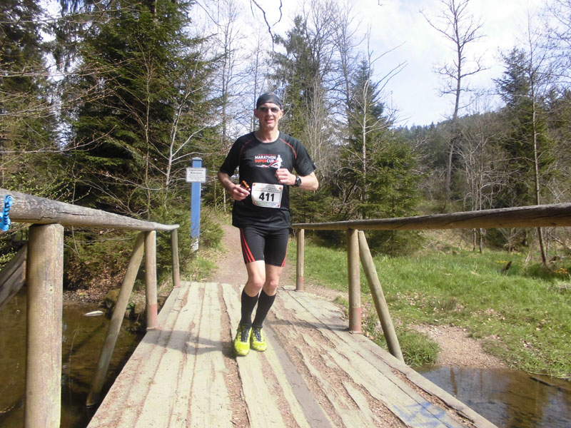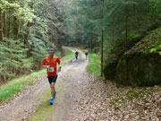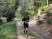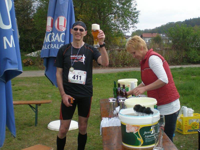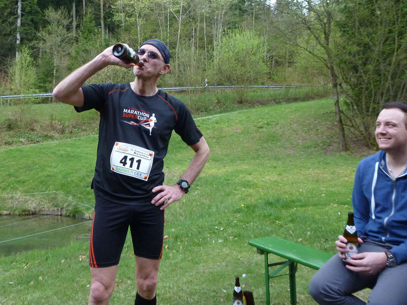 Aber dann folgt wieder mein Terrain, der Trail und es geht viel bergab, hier kann ich wieder laufen und mich absetzen. Die Versorgungsstation hat jetzt auch Bier im Angebot, ich könnte auch richtiges haben, entscheide mich aber für Alkfrei. Auf freier Flur kann ich plötzlich wieder Greppi vor mir ausmachen, ich lege eine Schippe drauf. Verschafft mir auch zusätzliche Luft nach hinten. Auf der Staatsstraße ist es soweit, etwa bei Km 30 bin ich dran und kann ihn sogar überholen und mich absetzen. Von den Damen ist nichts mehr zu sehen.