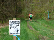 Die erste Verpflegungsstelle mit Bananen, Äpfeln, Wasser und auch schon Cola erreichen wir nach 4,5 km. Meine Verfolgerinnen ziehen wieder vorbei, ich bin wieder Letzter. An der Prager Schikane wird es noch etwas rustikaler, das gefällt mir. In einem stetigen Auf und Ab geht es weiter. Sechs Kilometer sind etwa gelaufen, die Grüne vor mir muss sich den Schuh binden, ich kann vorbei ziehen. Wenig später passiert der Schwarzen dasselbe Missgeschick, wieder die Schnürsenkel. Ob die sich abgesprochen haben? Greppi in orange, ein gutes Stück vor mir, dient mir immer als Anziehungspunkt. Ich kann tatsächlich wieder aufschließen und mich so von den Verfolgerinnen etwas distanzieren.