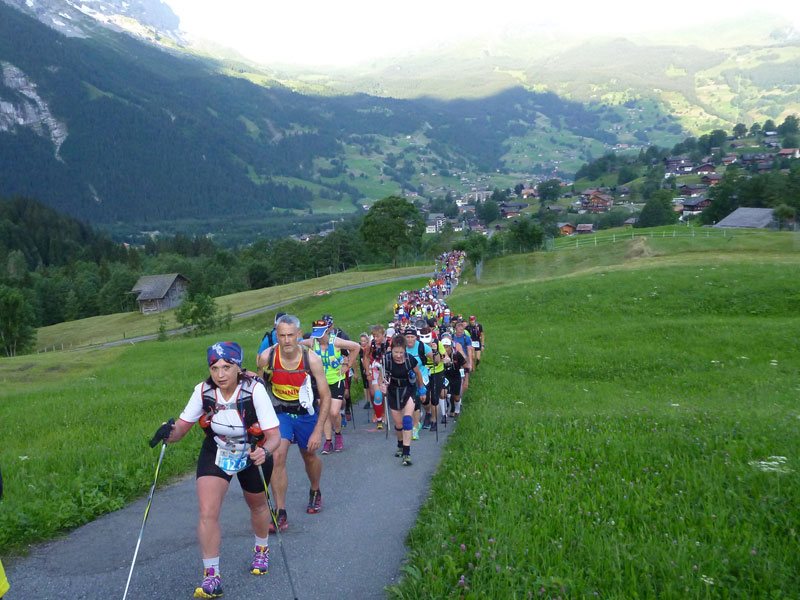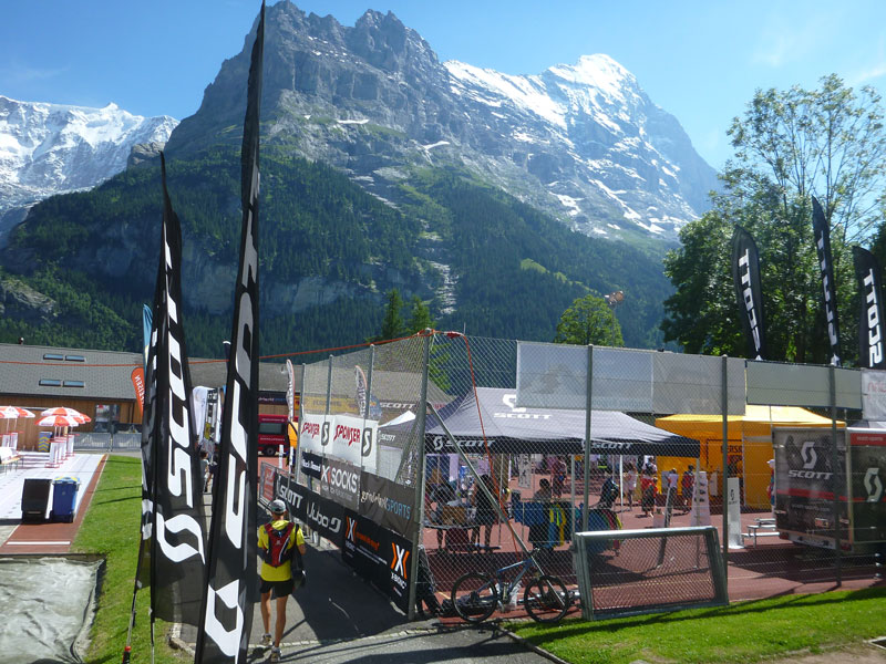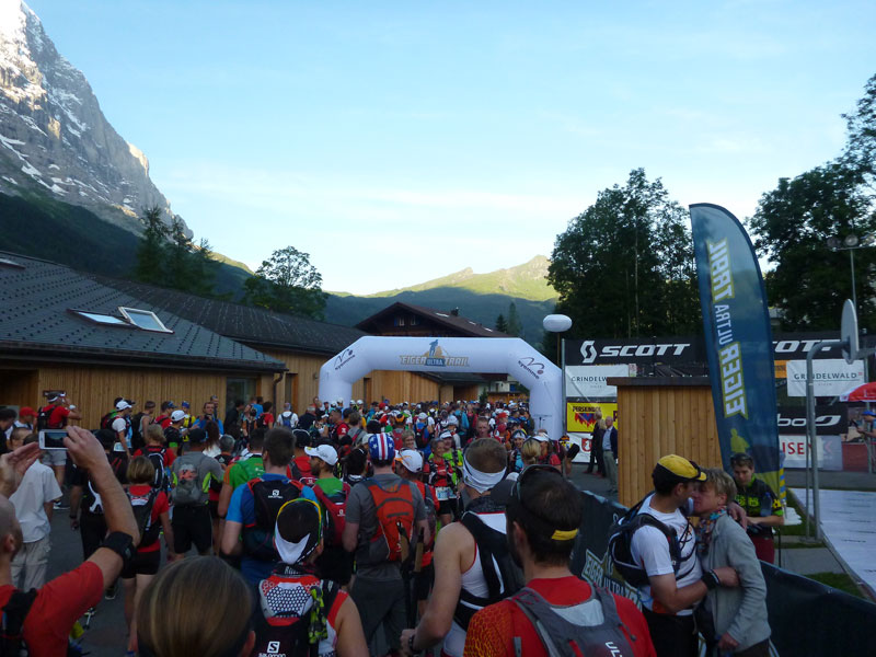 Nachdem alle Vorbereitungen und Einweisungen bereits am Vortag stattgefunden haben, reicht es mir locker erst eine viertel Stunde vor dem Startschuss auf dem Sportgelände von Grindelwald einzutreffen. Noch befinden wir uns im Schatten der mächtigen Wand des Eiger, aber der strahlend blaue Himmel und die Wettervorhersagen künden uns hohe Temperaturen im Laufe des Tages an. Die ebenfalls in den Startunterlagen enthaltene Tube „Eiger Sonne“ mit Lichtschutzfaktor 30 zeugt von großer Weitsicht der Organisatoren.