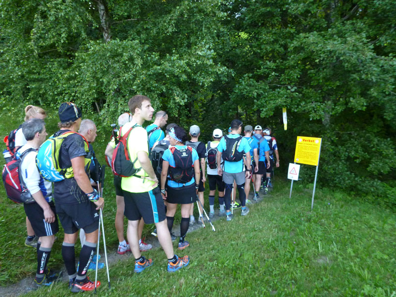 100 Meter unterhalb des Ausgangs der VP sitzt Dieter und richtet bereits wieder seinen Knieverband. Ein Finish ist für ihn nicht mehr möglich, aber bis Burglauenen will er sich durchschlagen. Ich wünsche ihm viel Glück dabei. Es geht zwar überwiegend „nur“ mehr abwärts, die 9 km bis zur Station haben es aber in sich.