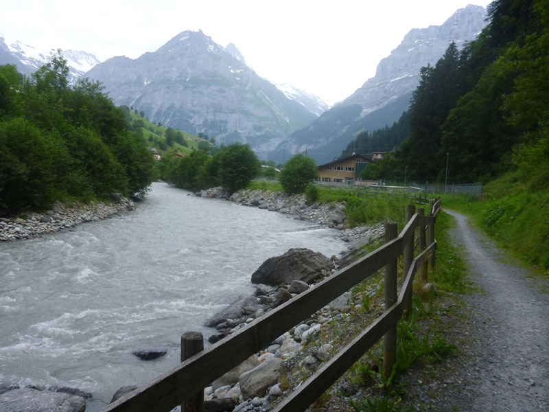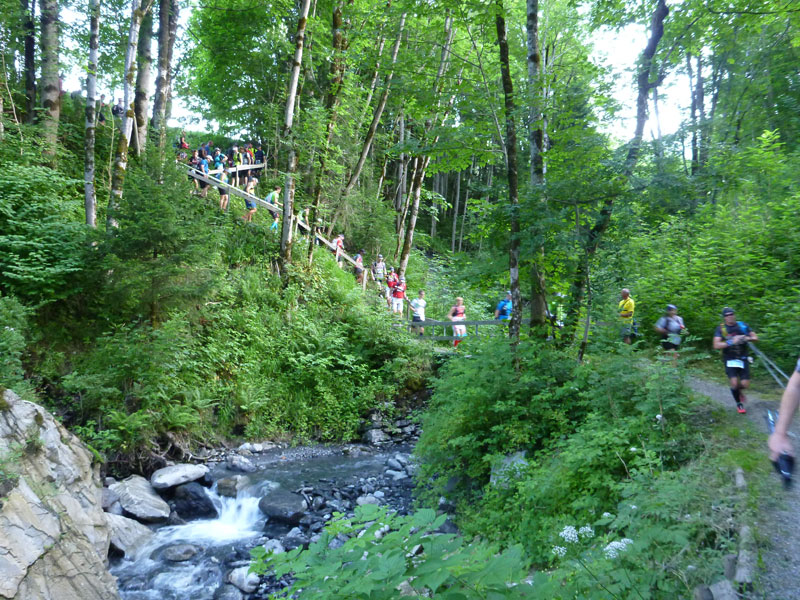 Nach etwa zwei Kilometer kommt die erste Engstelle, beim Briefing gestern Abend wurden wir schon darauf vorbereitet. Der schmale Übergang über einen kleinen Nebenarm der Schwarzen Lütschine kann nur hintereinander passiert werden. Vom Veranstalter ist hier auch ein ausdrückliches Überholverbot mit Strafzeitankündigung ausgesprochen worden. |