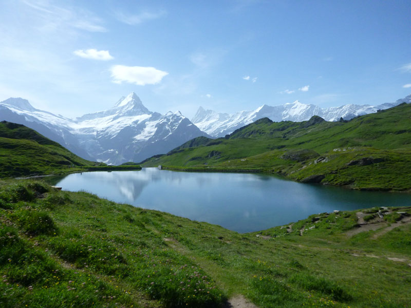 Ab First führt uns ein großzügig angelegter Weg in leichtem Auf und Ab zum Bachalpsee. Von seinem Ufer aus bietet sich ein herrliches Panorama auf die mit ewigem Eis bedeckten Berner Alpen, im Wasser spiegelt sich majestätisch, das mir jetzt schon bekannte, über 4000 Meter hohe Schreckhorn. Kein Wunder dass der Platz auch ein begehrter Ort eines Event-Fotografen ist. Die Bilder, die von jedem Teilnehmer geschossen werden können sich auch wirklich sehen lassen. Der See ist natürlichen Ursprungs und wird durch die Schneeschmelze und Niederschläge gefüllt, dass er bereits seit über 100 Jahren auch dazu dient, Energie für Grindelwald zu erzeugen, fällt eigentlich niemand auf. Wir haben hier 16 km hinter uns.