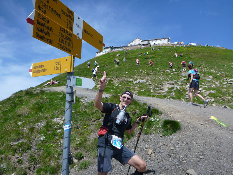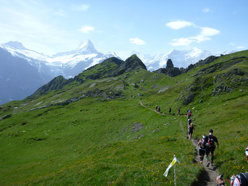 In zunächst leichtem Auf und Ab führt unser Kurs weiter zum First, einer Verflachung des Südwest-Rückens zum Widderfeldgrätli. Wer hin und wieder einen Blick auf die zahlreich aufgestellten Wegweiser wirft, wird feststellen, dass neben den gelben Hinweistafeln auch eine Ausschilderung des Eiger Ultra Trail existiert. Die große Nachfrage bewog das Organisationskomitee dazu, den Kurs den ganzen Sommer erlebbar zu machen. In Zusammenarbeit mit den Gemeinden wurde die fixe Beschilderung über die kompletten 101 km der langen Strecke realisiert. 250 Wegweiser ermöglichen so Trainingsfleißigen auf der Originalstrecke zu trainieren. Die weißen Schilder sind mit einem grünen Aufkleber des Eiger Ultra Trail versehen.