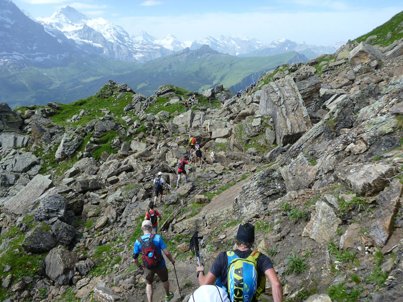 Nach passieren einiger weiterer klitzekleiner Seen beginnt für mich einer der schönsten Abschnitte des Kurses. Nicht umsonst nennt sich die E51-Strecke auch Panorama Trail. Die Aussicht auf die jetzt direkt gegenüberliegenden Eiger, Mönch und Jungfrau ist einfach atemberaubend. Aufsteigend bewegen wir uns weiter bis zum Sattel Spitzen. Bis zum Übergang am Grad sind auch kleinere Kletterpartien zu absolvieren. Ich genehmige mir eine ein- oder zwei-Minütige Pause um die grandiose Aussicht zu genießen, kann da nicht einfach so vorbei laufen.