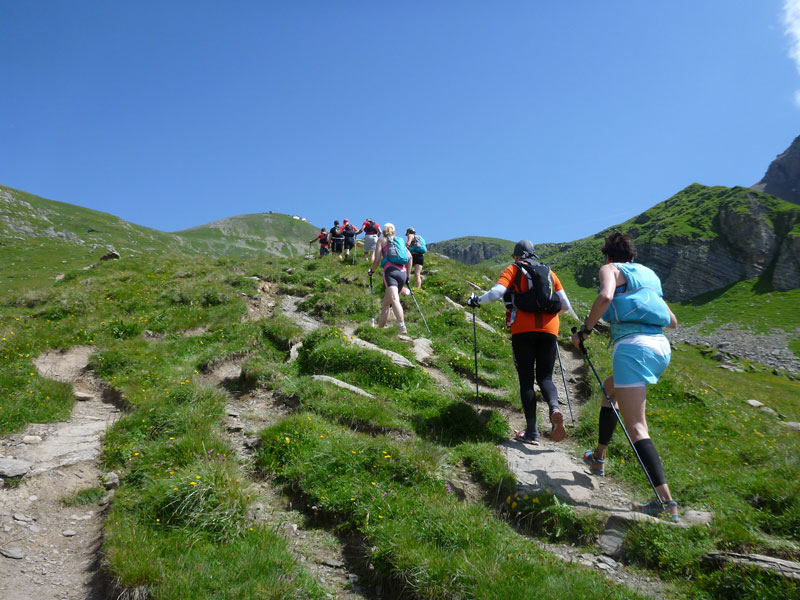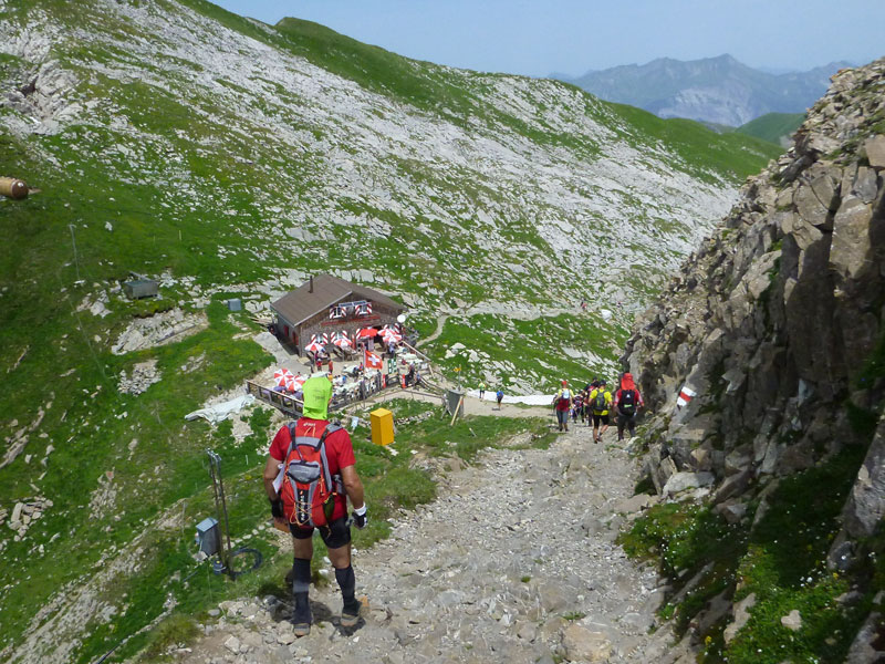 Eine Richtungsänderung um fast 180 Grad beschert uns den Ausblick auf das 2680 m hoch gelegene Gasthaus auf dem Gipfel des Faulhorns, das zugleich unser nächstes Ziel ist und auch den höchsten Punkt der beiden Langstrecken beinhaltet. Bisher hatte ich meine Stöcke noch am Rucksack verschnürt, hier lohnt sich der Einsatz in jedem Fall. Über der Waldgrenze gelegen zieht sich der Aufstieg über 3 km an einem durchgehend sonnigen Südhang nach oben. Der steile Abschnitt beinhaltet über 600 Höhenmeter. Aber zumindest hat man sein nächstes Etappenziel immer vor Augen und kann gut erkennen wie sich die Distanz verringert.