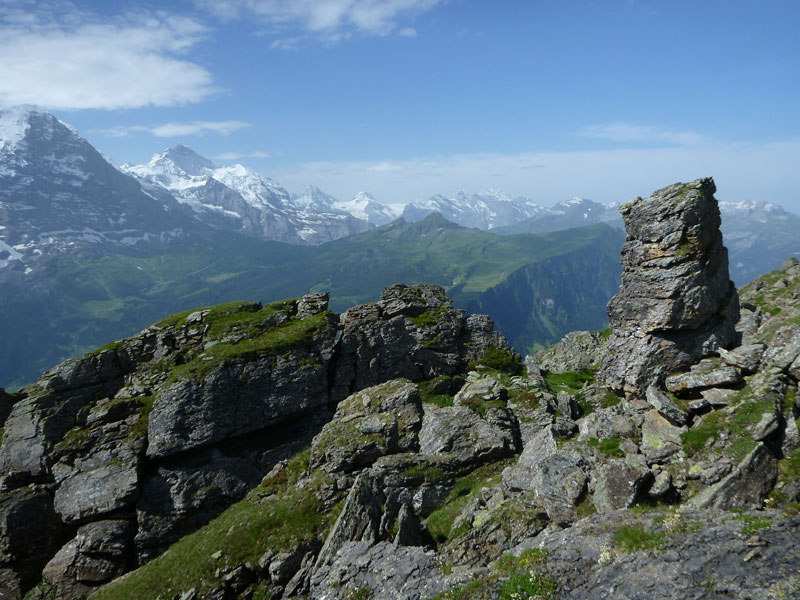 Uns bietet sich hier eine erste wunderbare Aussicht aufs Tal und die umgebenden Felswände von Wetterhorn, Schreckhorn und Eiger. Im Gegensatz zur Kleinen Scheidegg liegt die Grosse Scheidegg paradoxer Weise sogar etwa 100 Meter niedriger und ist zudem auch weniger besucht als diese. Das Groß im Namen bezieht sich auf die größere Bedeutung, der Übergang ins Haslital war in älteren Zeiten für die Grindelwalder wichtiger im Vergleich zum Pass nach Wengen und ins Lauterbrunnental.