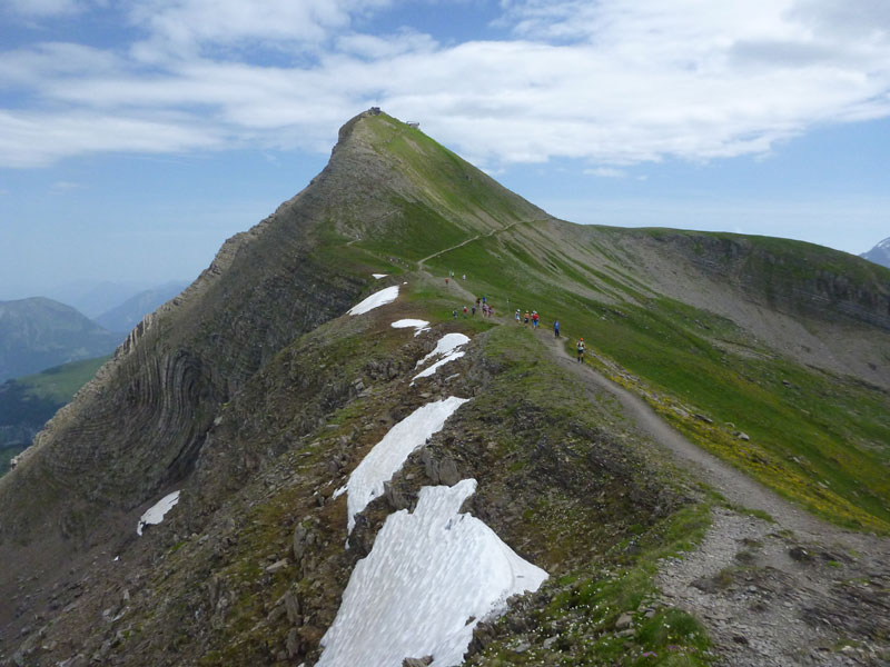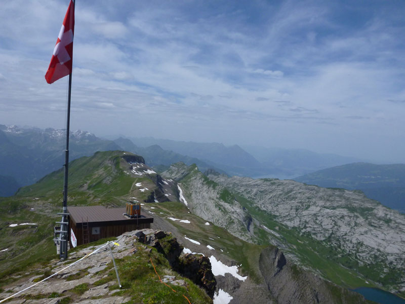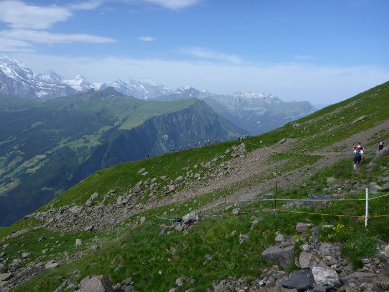 Über den Rundumblick auf die Berner Alpen und die Seen im Tal muss ich jetzt wahrscheinlich nicht mehr viel erzählen, er ist einzigartig. An der VP wird uns auch warmer Tee geboten, reißenden Absatz findet der bei den heutigen Temperaturen aber nicht, obwohl hier oben doch ein leichter, kühlender Wind zu verspüren ist und somit recht angenehme Bedingungen schafft. |