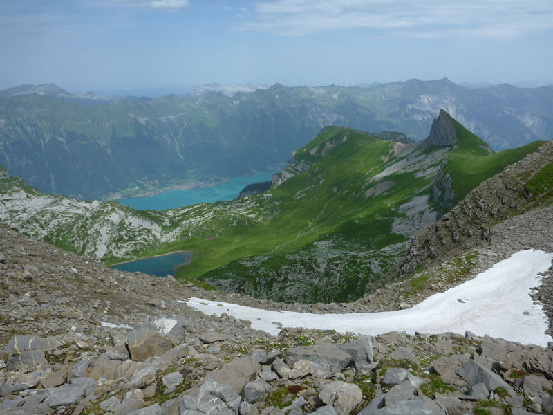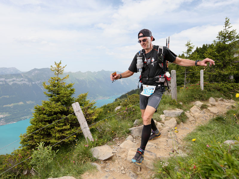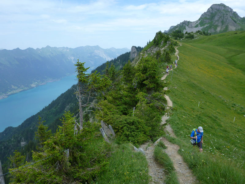 An den Flanken des Indri-Sägissa führt uns der Trail durch urwüchsige Karstlandschaft. Von unten leuchtet in blaugrün der Sägistalsee und ansatzweise auch der Brienzersee herauf. In voller Pracht zeigt sich dieser aber erst an einem Kammübergang unterhalb des Loucherhorn. Auch hier ist wieder eine Location die sich einer der Event-Fotograf nicht entgehen lässt. Ständig wechselnde Perspektiven und Aussichten lassen landschaftlich überhaupt keine Ermüdung aufkommen, da haben es die Beine bei den hohen Anforderungen nicht so leicht. Ein Treppenaufstieg steht ebenso auf dem Programm wie steile Bergab-Passagen.