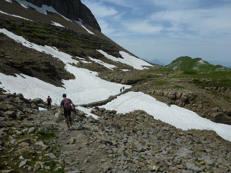 Auf der anderen Seite der Gipfelkuppe verlassen wir das Faulhorn. Nach einem ersten rustikalen Bergabstück über Geröllhalden geht es zunächst auf gemäßigten Trails weiter. Zunehmend werden die schmalen Bergwege aber immer technisch anspruchsvoller. Oft sind gefährliche, felsige Stellen, teils sogar mit kleinen Restschneefeldern zu passieren, auf die aber meist mit Hinweistafeln aufmerksam gemacht wird. Über einen abschüssigen Hang gelangen wir zum Berghaus Männdlenen, hier ist für uns aber keine offizielle Versorgung vorgesehen, unsere Getränke-VP folgt erst etwa einen Kilometer später in Egg.