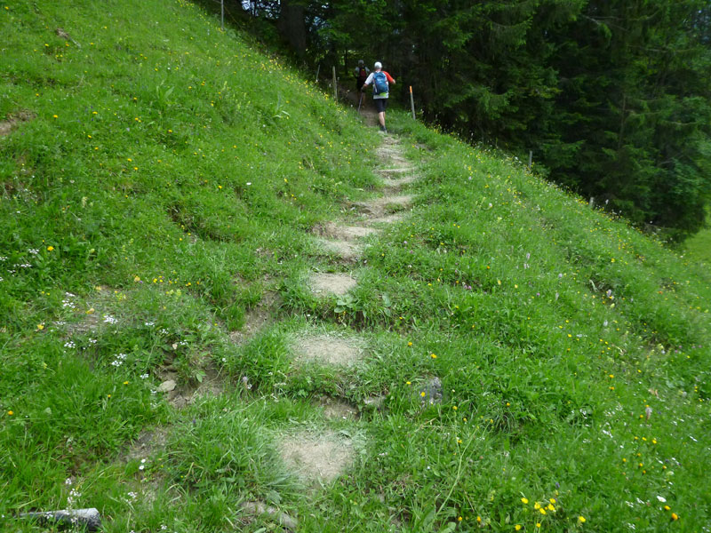Ein Abschnitt über einen frisch gemähten Wiesenweg läuft sich zur Abwechslung aber wunderbar angenehm …zu angenehm, so schön im Laufen verpasse ich eine Spitzkehre und laufe noch etwa 200 Meter weiter einen Hang hinab. Dass hier keine Markierung mehr folgt, macht mich aber stutzig und auch die beiden, die dem Esel in etwas Abstand gefolgt sind halten ein. Sie kontrollieren oben die Strecke, finden die Markierung und beordern mich anschließend wieder zurück. Nur 200 Meter Verlaufen auf einem 51 km Trail ist ein Wert der mich nicht besonders tangiert, das ist immer mal drin. Dafür wartet aber vor einer Sennhütte ein herrlich, eiskalter Brunnen und den habe ich für mich ganz alleine.