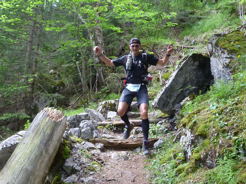 Schmale Bergpfade an Hängen entlang und Schotterstraßen wechseln sich in diesem Abschnitt immer wieder mal ab. Über eine Wiese erreichen wir die VP First. Das Verpflegungsangebot ist reichhaltig. Neben Energy-Gels und-Riegeln werden auch Brot, Kuchen und Früchte angeboten. Zur Getränkeaufnahme gibt es heuer eine Neuerung, es werden keine Becher mehr ausgeben, aus Gründen des Umweltschutzes. Beim Empfang der Startunterlagen wurde jedem ein Becher mitgegeben. Was für mich anfangs wie ein ganz gewöhnlicher zerbrechlicher Plastikbecher aussah, entpuppt sich im Verlaufe des Tages als wirklich unglaublich flexibles High-Tech-Teil das problemlos allen Anforderungen des Laufes gewachsen ist. Ich kann ihn außen in meinen Rucksack quetschen ohne irgendwelche Rücksichtnahme.