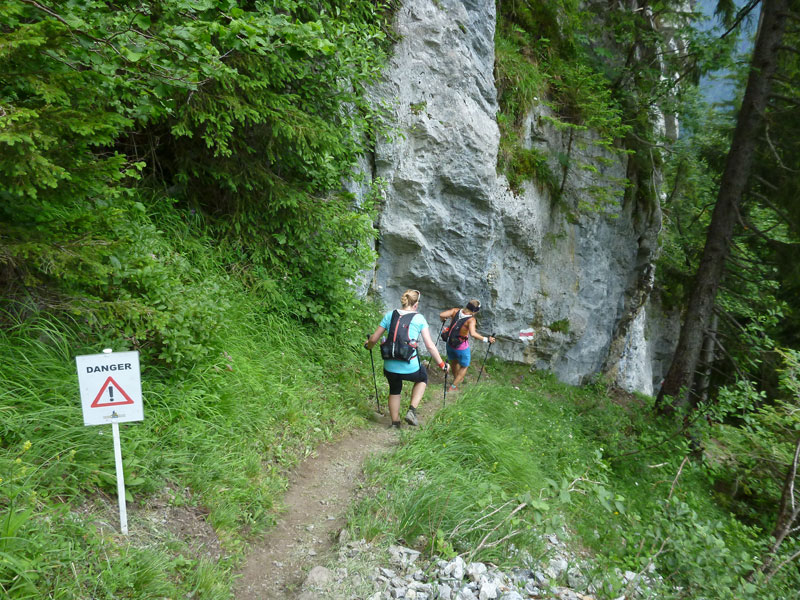 An den Flanken des Wetterhorns nimmt die Steigung spürbar zu. In Serpentinen geht es über Alpweiden auf Singletrails nach oben. Noch spendet uns die gewaltige Felswand Schatten, so empfinde ich die Temperaturen als sehr angenehm.