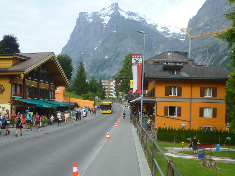 Den letzten nennenswerten Anstieg bekommen wir an der Ortsgrenze von Grindelwald serviert. Wer den noch laufen kann, ist ein zäher Hund oder muss heute wo anders gewesen sein. Unser verlängerter Zieleinlauf beginnt praktisch durch die Dorfstraße von Grindelwald, vielleicht 500 Meter dürften es sein, bis es nach rechts in den Veranstaltungsbereich und für ein paar Schlussmeter abwärts geht durch das Zielbanner.