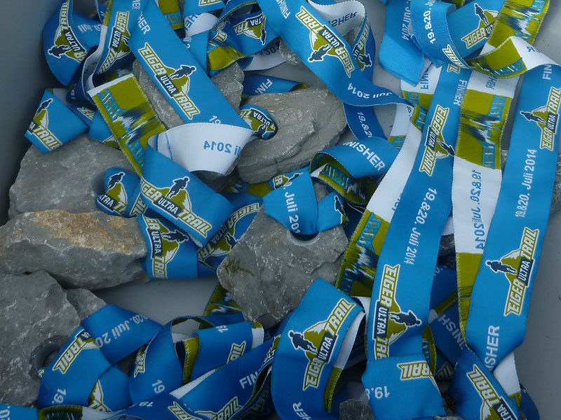 Nach dem Zieldurchlauf darf jeder eine besondere Finishertrophäe in Empfang nehmen: Ein Stück Eiger. OK-Chef Ralph Näf persönlich, hat die in etwa 1500 benötigten kleinen Felsbrocken, oben am Eiger Gletscher gesammelt. Mit Loch und Bändel versehen, stellen sie eine wirklich außergewöhnliche Medaille dar, die in meiner Sammlung einen Ehrenplatz bekommt. Dazu überreicht man mir noch ein hochwertiges Finishershirt.
