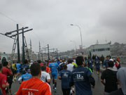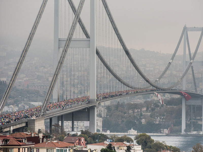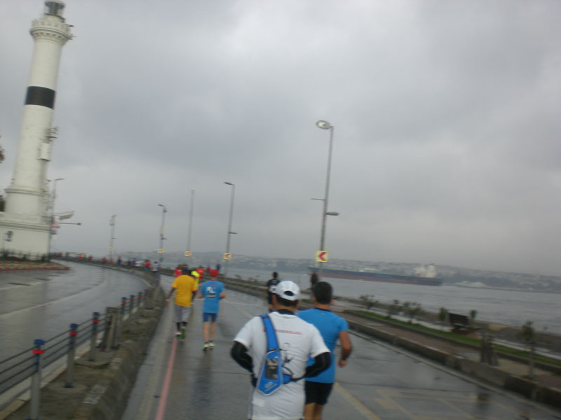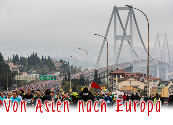 Um 9 Uhr ist Start des Marathon und des 15 km Laufs zeitgleich. Und wieder herrscht null Ordnung, jeder will weg und kommt doch nicht voran. Da „laufen“ dann vorneweg nicht so schnelle, Langsame und noch Langsamere die lange Steigung auf die Bosporusbrücke hoch, Richtung Europa. Dadurch habe ich viel Zeit zum Sightseeing! Bis ich mich in mein Lauftempo finde sind schon mal 3 Kilometer vorbei.