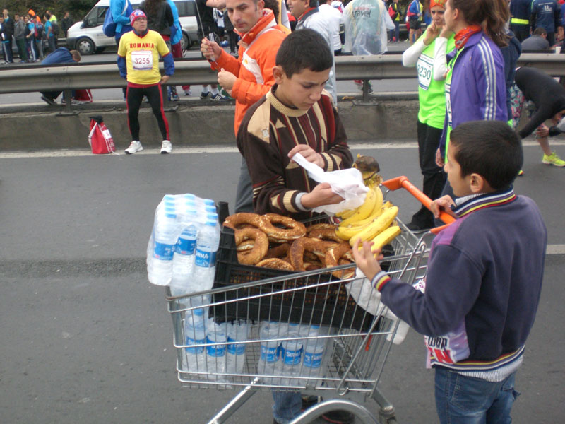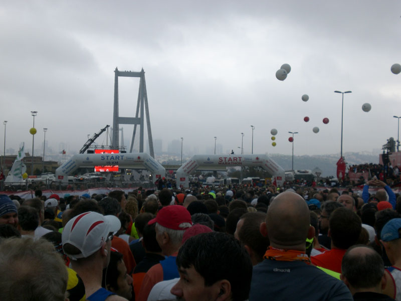 Dann ist Marathontag. Ab 7 Uhr fahren die Busse vom Ziel an den Start. Und wieder keine Ordnung und kein Plan zum Einsteigen. Eine riesige Menschentraube drückt und schiebt in Richtung der vorfahrenden Busse. Endlich bin ich irgendwie drin, die Türen gehen kaum zu, geht's zum Start auf die asiatische Seite von Istanbul. Dort angekommen erkenne ich keinerlei Startblöcke. Gibt's auch nicht. So steht jeder da wo er will und zwischen diesem Gedränge stehen Kinder mit Einkaufswägen und wollen Wasser und Gebäck verkaufen. Irre!