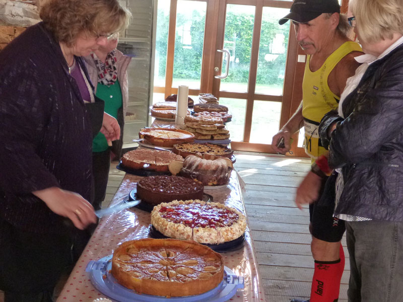 Weinbau zählt hier auch zur Haupterwerbsquelle, ca. 80 ha Rebfläche werden bewirtschaftet und überwiegend mit Trollinger, Lemberger, Portugieser und Sylvaner kultiviert. Jan ist aber besonders vom üppigen Kuchenbüfett hingerissen und genehmigt sich noch ein zweites Frühstück. Nach dem Zieleinlauf wird er dann wieder anstehen, so wie ich ihn kenne. |