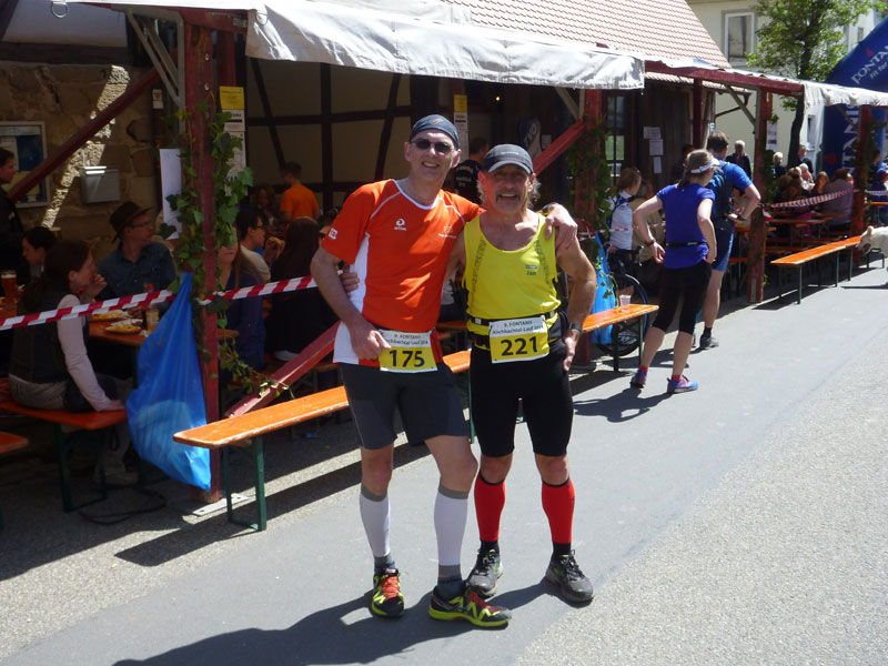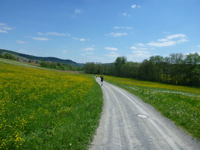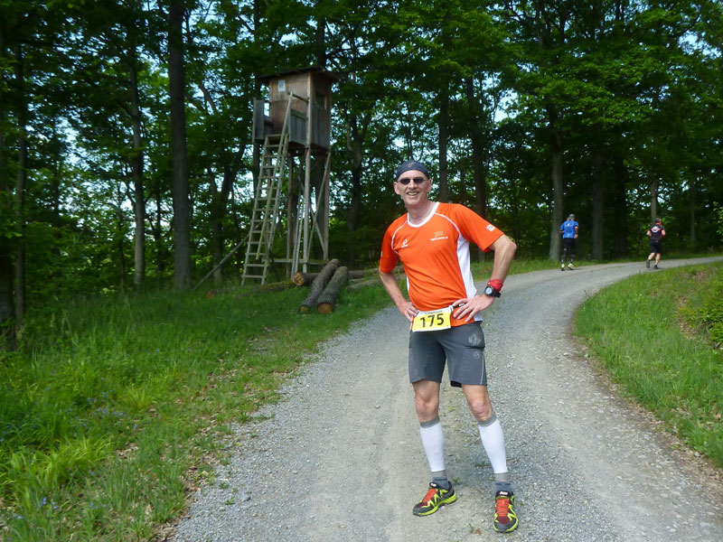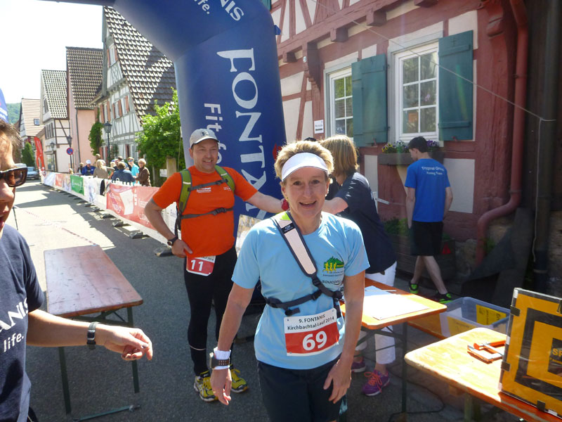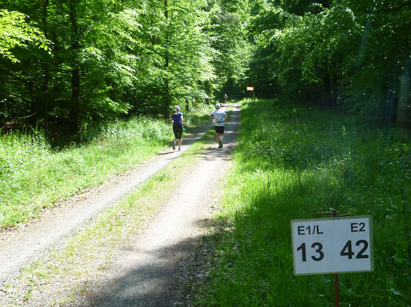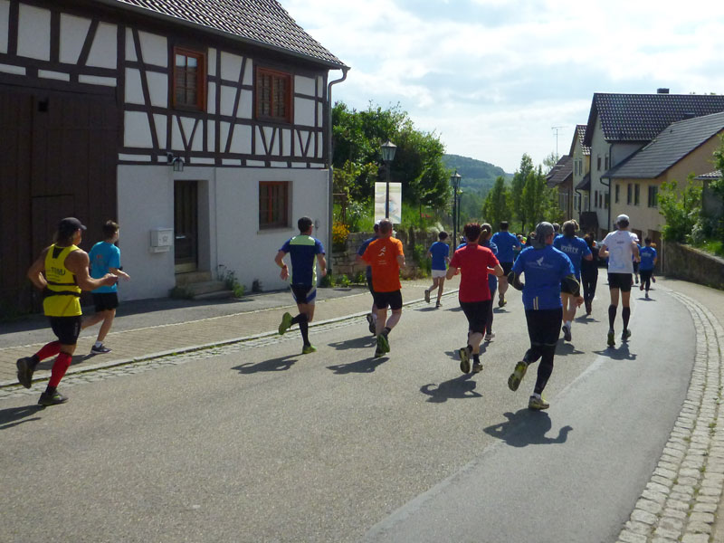 Bis Kilometer 22 sind wir, bis auf einen kurzen Zwischenanstieg, immer am Abwärtslaufen auf Waldwegen. Kurz vor einer letzten Getränkestation am Kirchbachhof verlassen wir den Forst. In der Sonne führen uns die beiden Schlusskilometer über Feldwege nach Ochsenbach zurück. Eine letzte giftige Steigung bringt uns in den Ort hinein, die meisten gehen hier nur noch. Ich ziehe das heute durch. Der Zieleinlauf über den vollbesetzten Festplatz auf der Dorfstraße ist große klasse.
