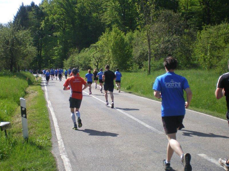 Ab km 10 ist die kleine Erholungsphase wieder beendet, ein erneuter Aufstieg auf den Baiselsberg steht an. Eine Schleife führt uns fast durchgehend ansteigend zur schon einmal besuchten Getränkestation auf dem Berg. Der Anstieg ist nur mäßig und somit deutlich schwächer als der erste, aber 4 km immer leicht bergauf ziiiehen sich hin. Je länger der Lauf dauert, umso besser fühle ich mich heute, ich kann komplett durchziehen, keine Beschwerden meiner dauergestressten Sehnen bremsen mein Aufwärtsstreben.