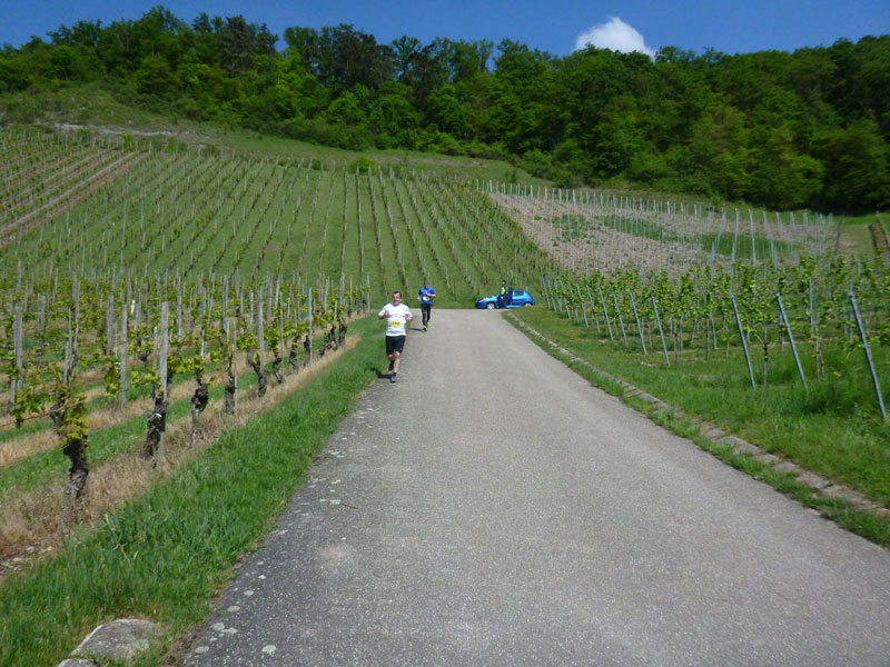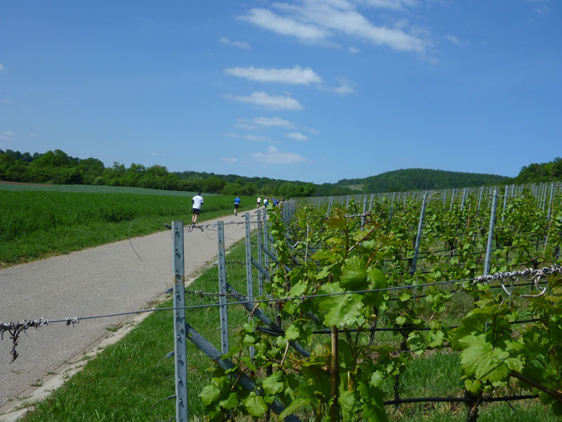 Nur kurz ist die Waldpassage, weiter geht es am Waldrand entlang bis zur ersten Verpflegungsstelle bei km 5 an den Weinbergen oberhalb Hohenhaslach. Hier ist die älteste und größte Weinbaulandschaft des Kirbachtals. Gesichert ist, dass bereits im 10. Jahrhundert rings um Haslach Weinberge vorhanden waren. Der Hohenhaslacher Wein war bereits im 12 Jahrhundertweit bekannt und beliebt. Um 1400 war der Weinertrag in Hohenhaslach so groß, dass man im Wirtshaus für einen Heller soviel Wein erhielt, dass man zweimal kommen musste, um ihn trinken zu können. Heute gedeiht hier auf 160ha Rebfläche ein markanter Rotwein. Zum kosten gibt’s aber leider keinen an der VP. Hätte doch was und ist ja heutzutage nicht mehr so unüblich.