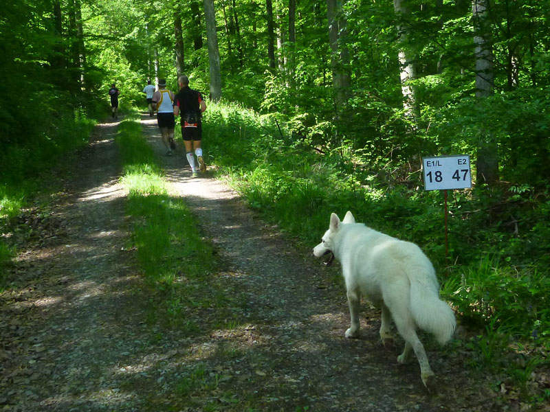 Auf unserem Kilometerschild 13 ist auch der Tachostand 42 abzulesen, somit sind wir ab hier auch gemeinsam mit den Läufern des Stromberg Extrem unterwegs. Der erste Ultra, auf den ich treffe, ist ein Vierbeiner, ein prächtiges weißes Exemplar. Leichtfüßig und scheinbar mühelos folgt er seinem Herrchen mit kleinem Abstand.