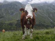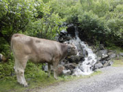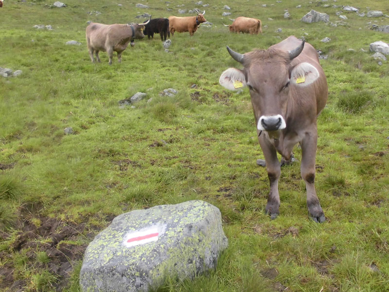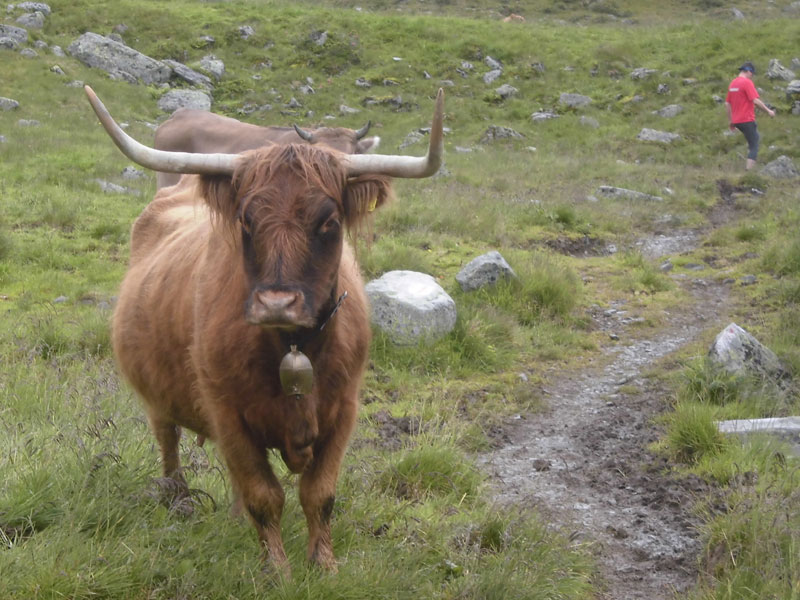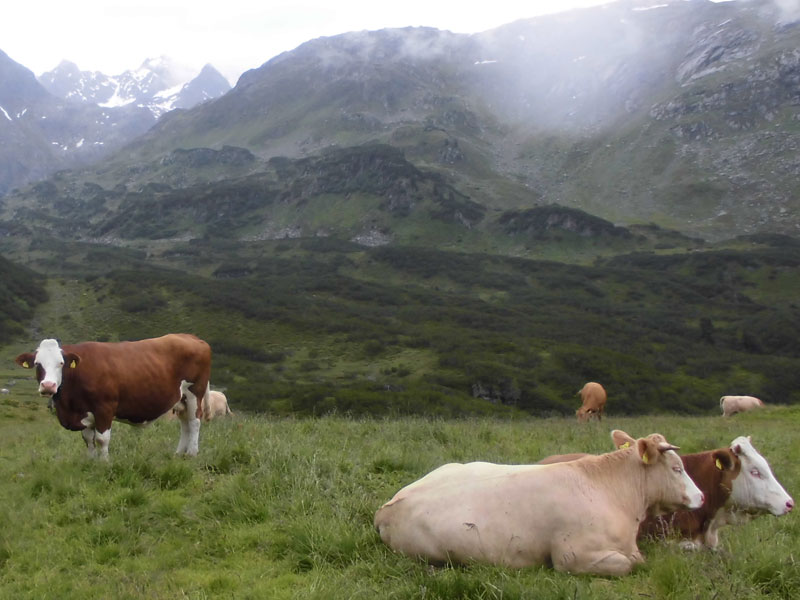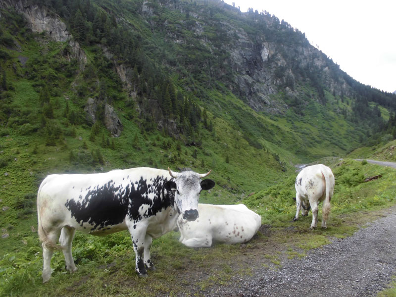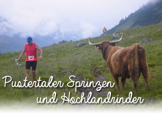 Braunvieh, Fleckvieh und Hochlandrinder flankierten die Strecke. Wenn ich nicht gerade einen guten Lauf hatte, einen „Lauf-Flow“, wie es Neudeutsch heißt, dann gab es auch mal ein paar Streicheleinheiten. Doch als ich um eine Ecke bog, traute ich meinen Augen kaum zu trauen. Pustertaler Sprinzen !! Für viele klingt das wie eine österreichische Leckerei, für mich als Rindviehfan stand eine Rarität vor mir. Die Pustertaler Sprinzen oder auch Pustertaler Flecken genannten Tiere unterliegen einem Arterhaltungs-programm, da die Rasse aktuell auf rund 400 Rindviecher geschrumpft ist. Sie gelten als Österreichs schönste Rasse und diesen Eindruck kann ich nur bestätigen. Besonders schöne Tiere zeigen besonders viel weiß und kontrastreich abgesetzte Sprinzen, also Flecken. Der Weißanteil der vor mir stehenden Tiere war ziemlich hoch, das schwarz dezent. Wunderschöne Tiere. Vielleicht komme ich ja mal wieder. Aber dann mir meiner Fotoausrüstung und mehr Zeit. So habe ich nur Zeit für zwei, drei Bilder auf meiner Laufkamera und weiter geht`s. Ab und zu drehe mich noch um, bevor ich mich den letzten zehn Kilometern der Stecke widme.